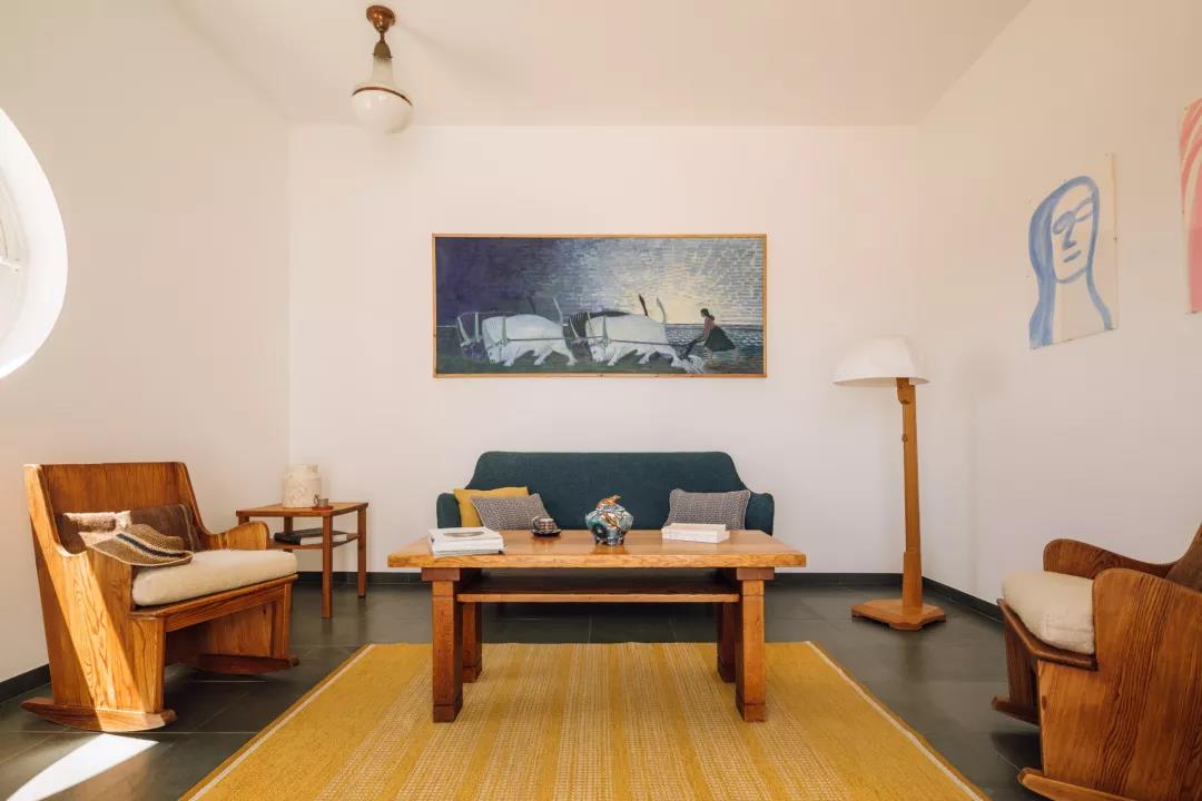 正式走入民宿建筑内部的大厅,能看到整个空间被简约精致的家具软装打扮得非常富有艺术气息。室内设计是由酒店的两位主人共同设计,他们将民间工艺和自身多年的艺术收藏与现代设计相融合,创造了简约的美学设计。