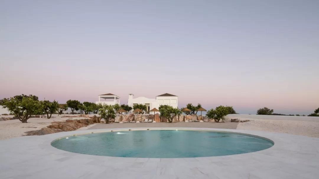初次进入民宿内,最能吸引你眼球的,想必是下面这个圆形泳池。圆形泳池采用的是当地的石材建造,蓝色的天空与蓝色的水面相互呼应,在边上的休息长凳上观看这一览无遗的景色,非常惬意。