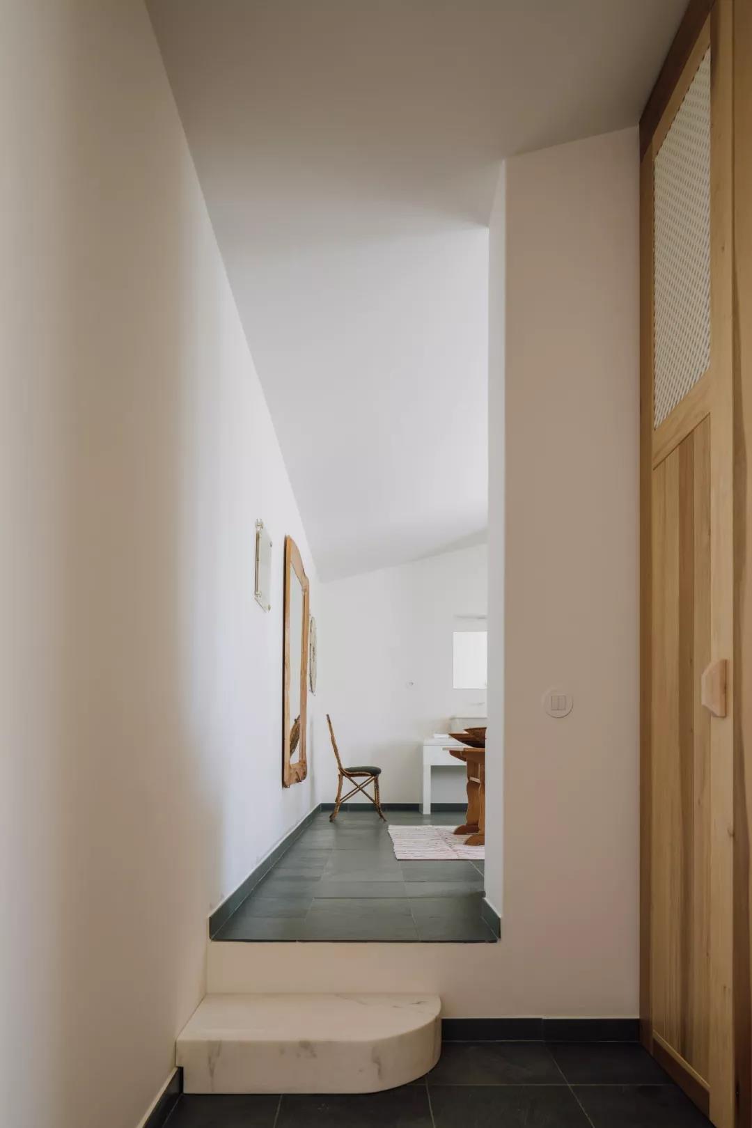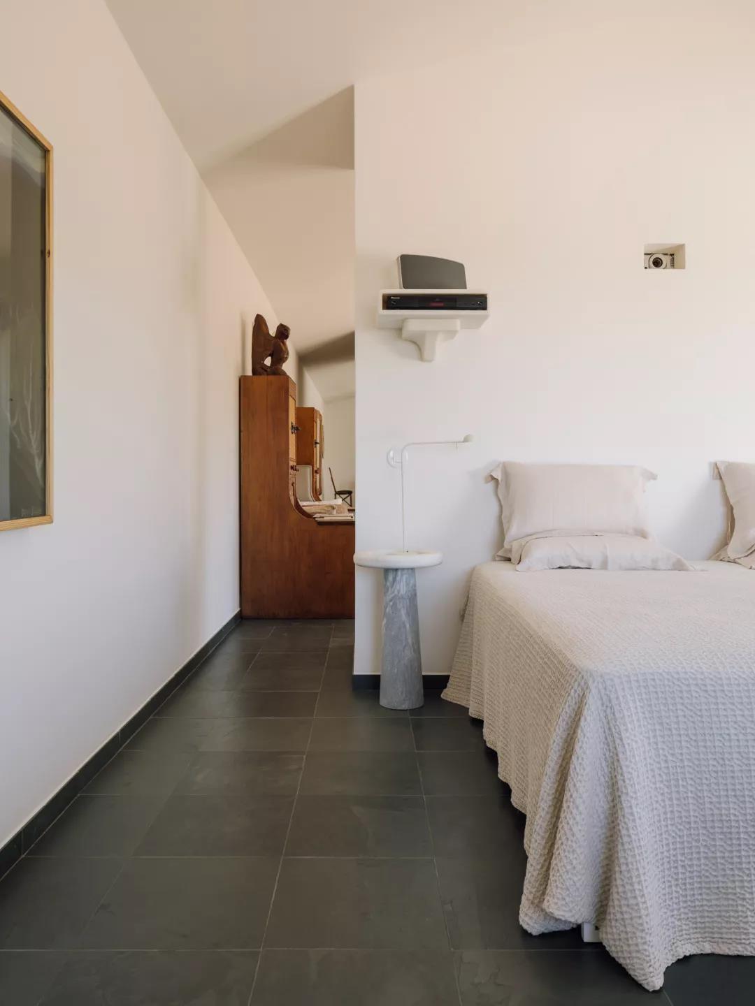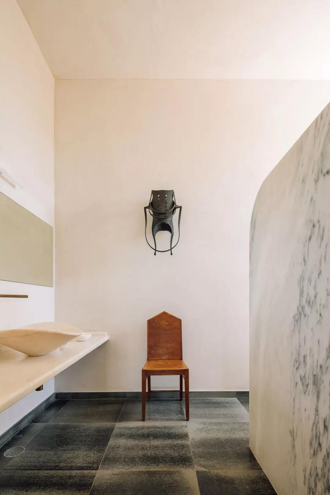 深色花岗岩地板与白色的石灰墙形成对比,淡雅的大理石、木头家具,用丰富的纹理与柔软的织布材质相中和。