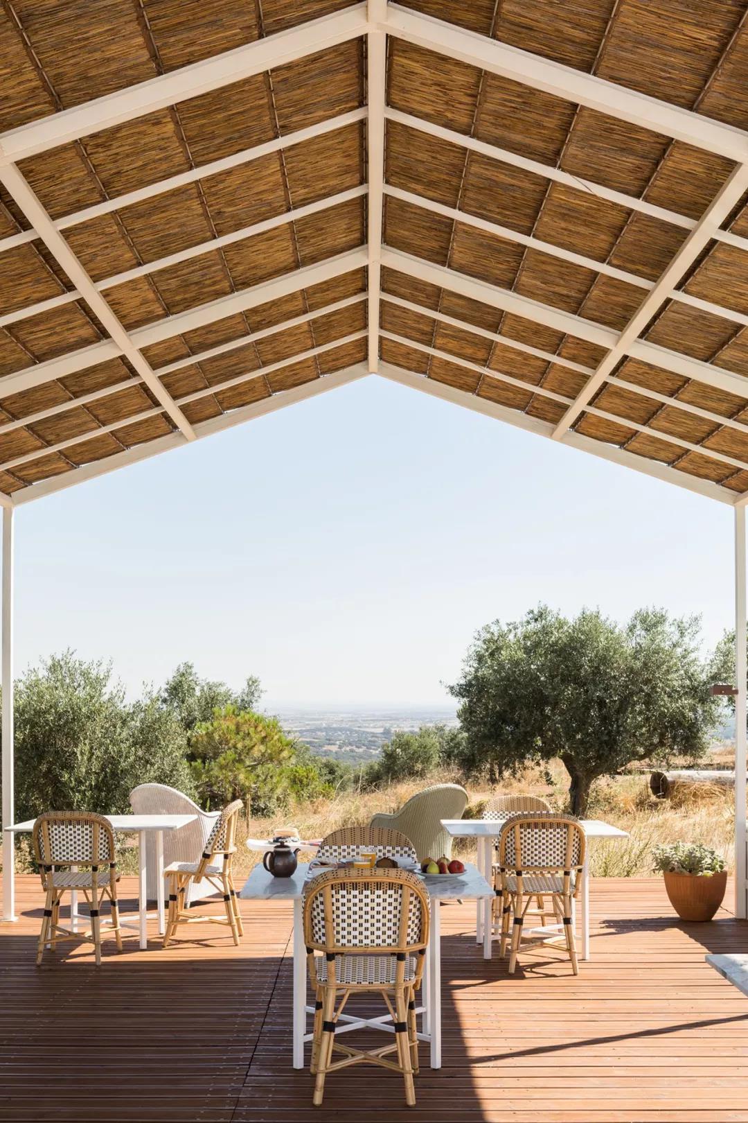 在这样的对比下,户外餐厅采取了相对对称的设计,原始的材料包括木头、茅草等,充满了乡村的闲适氛围。