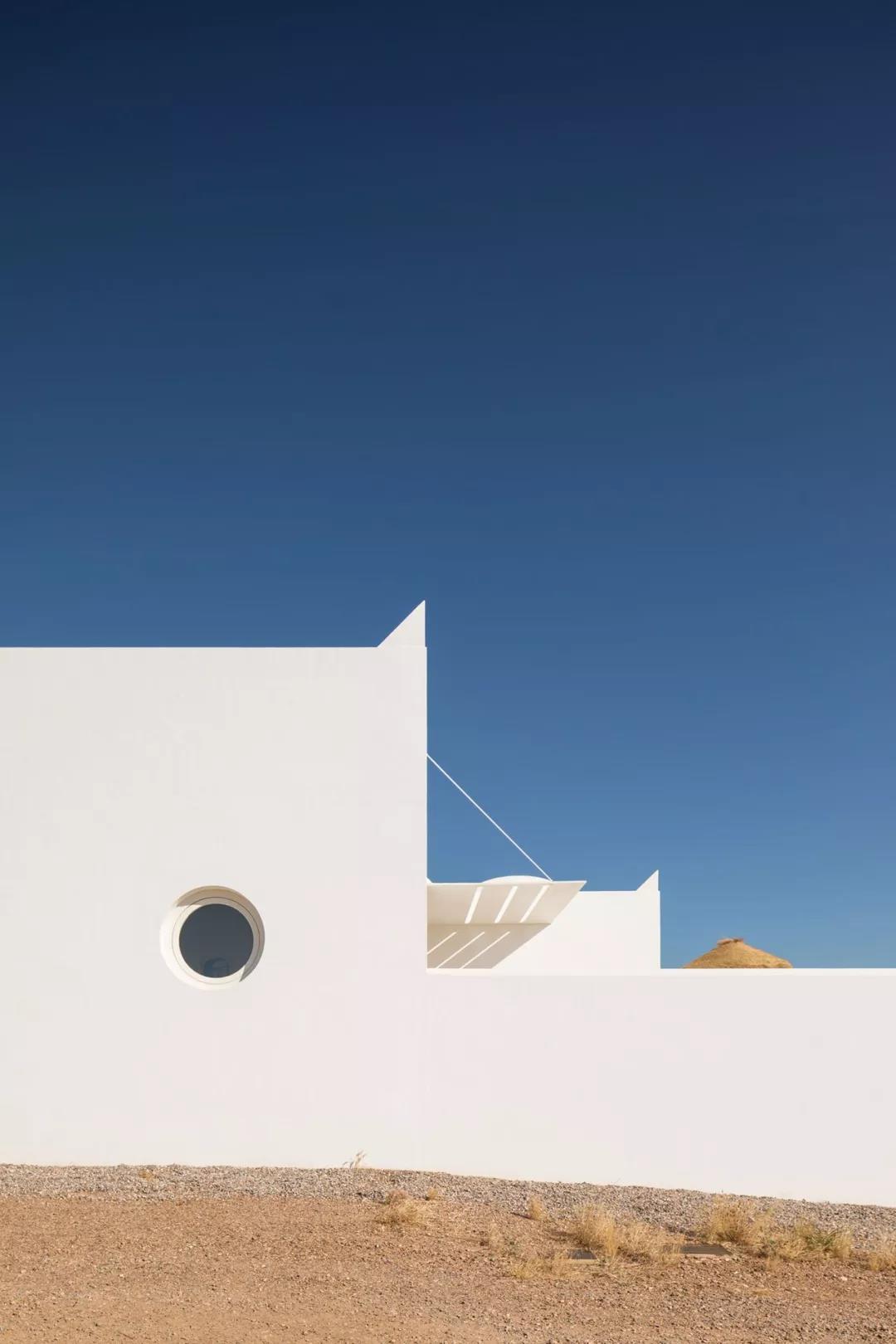 另外还有同样令人瞩目的还有不远处的户外餐厅。你要先通过拱形的门,才能进入餐厅区域。户外同样有一处方型泳池,与弧形的入口、圆形泳池形成对比。