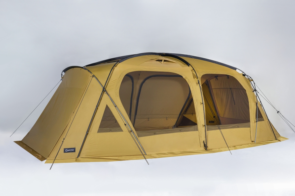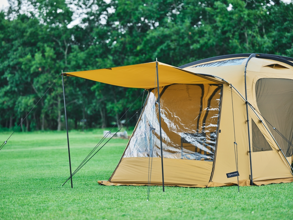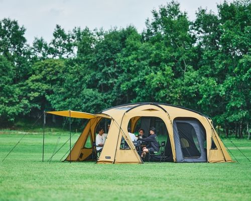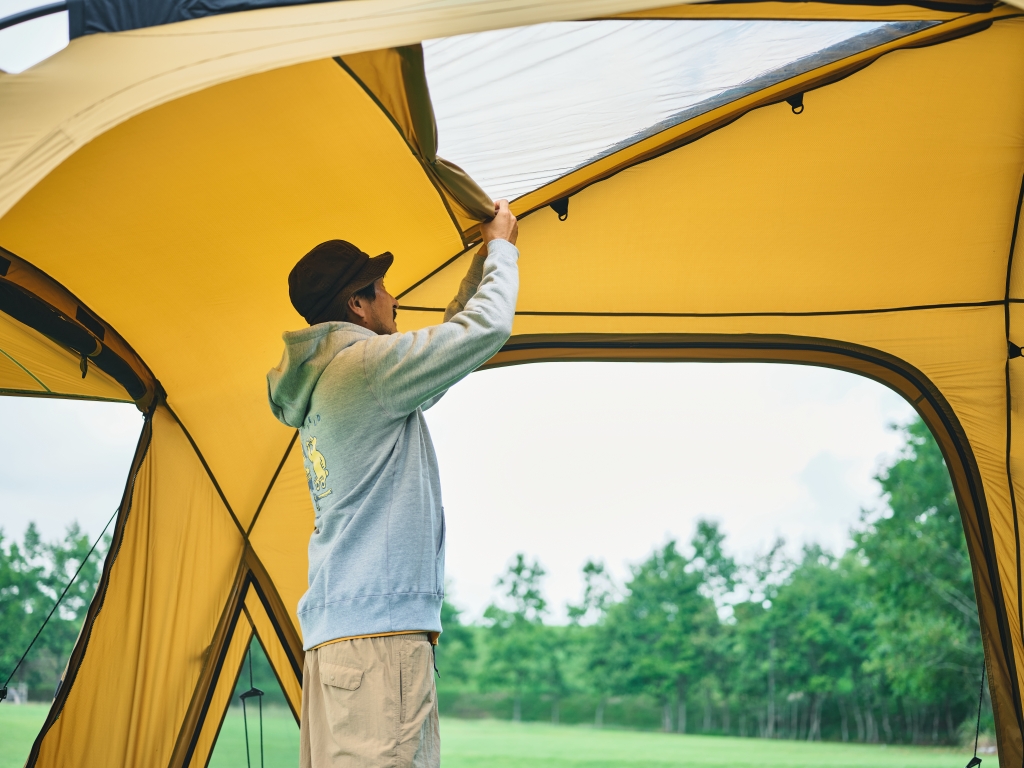 帐篷的椭圆形结构拥有宽敞的起居空间,且兼具舒适的居住体验,其目的是在露营地打造第二客厅OVAL TENT 的结构确保了充足的开放感,中心层高约 220 厘米,边缘层高约 175 厘米,即使站立也能自如活动——比传统双室帐篷更具体验感。此外,帐篷面料采用搭载菱形防撕裂结构的硅尼龙材质,兼具轻盈和坚固。