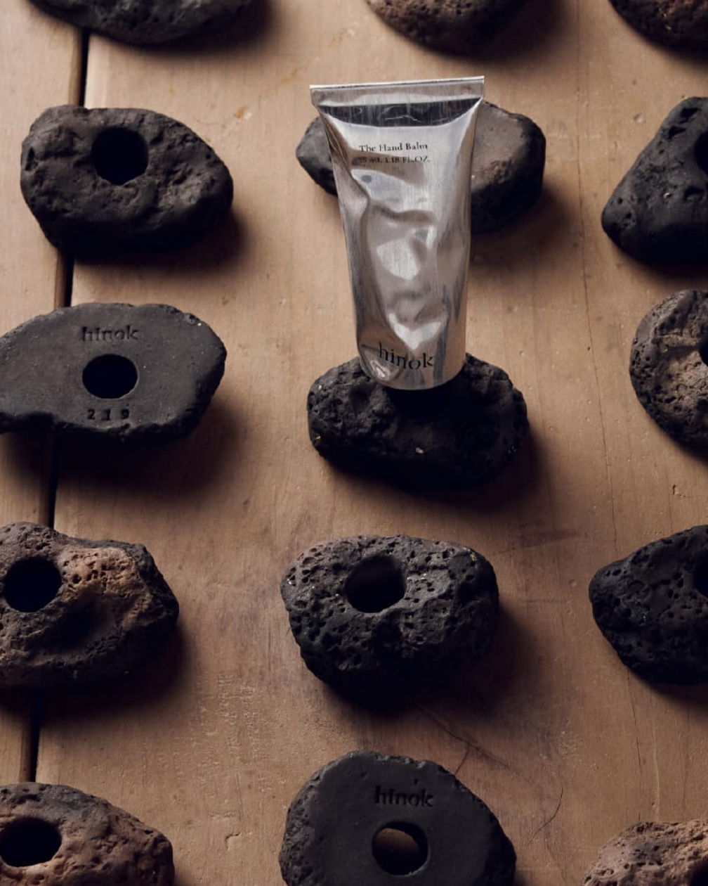 此外为了呈现出优雅的陈列效果,Hinok 还设计了专门的手工架。原料选用了济州岛的泥土进行人工捏造,然后采用高温烧制而成,整体有着一种玄武岩的风格质感。当然它的用途不仅仅只是用来陈列护手霜,同时还可以当作笔架和牙刷架等。