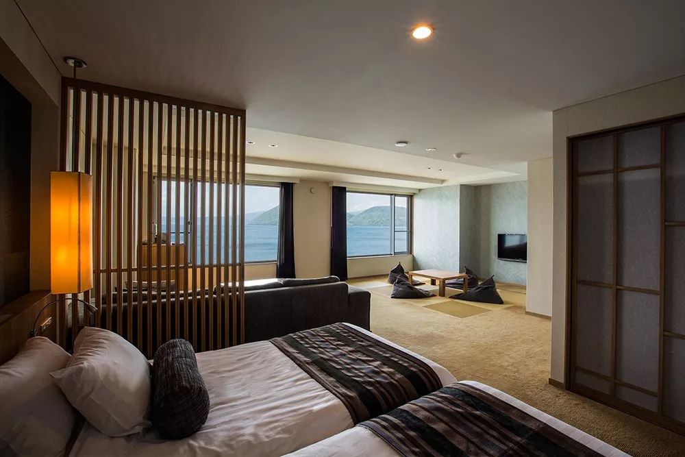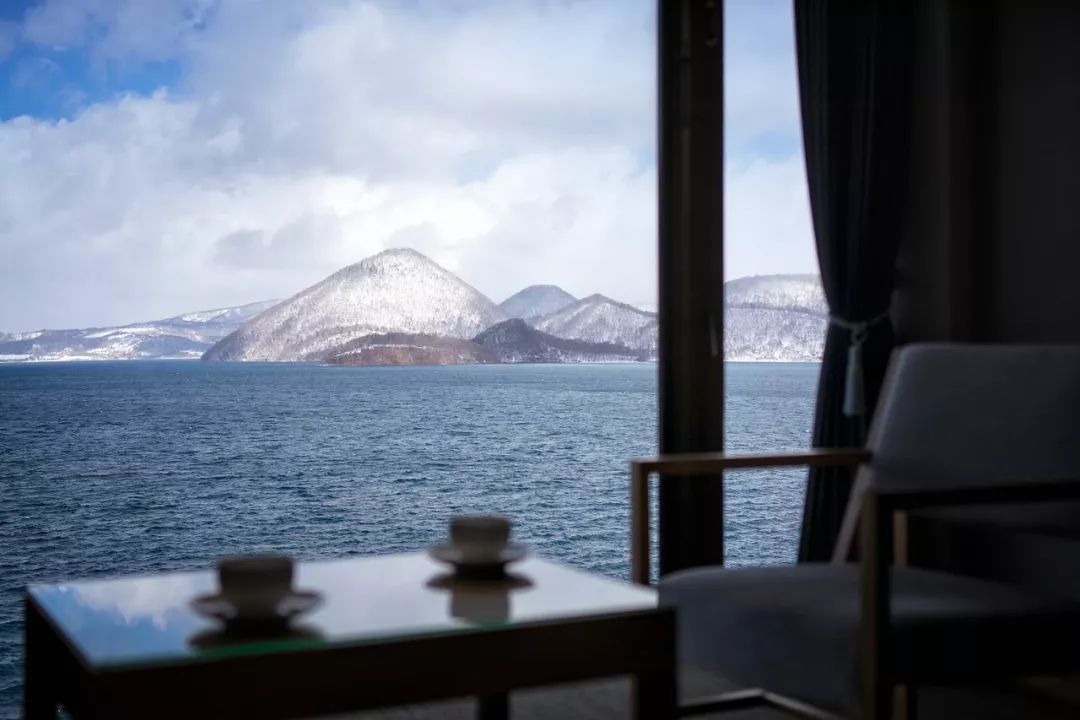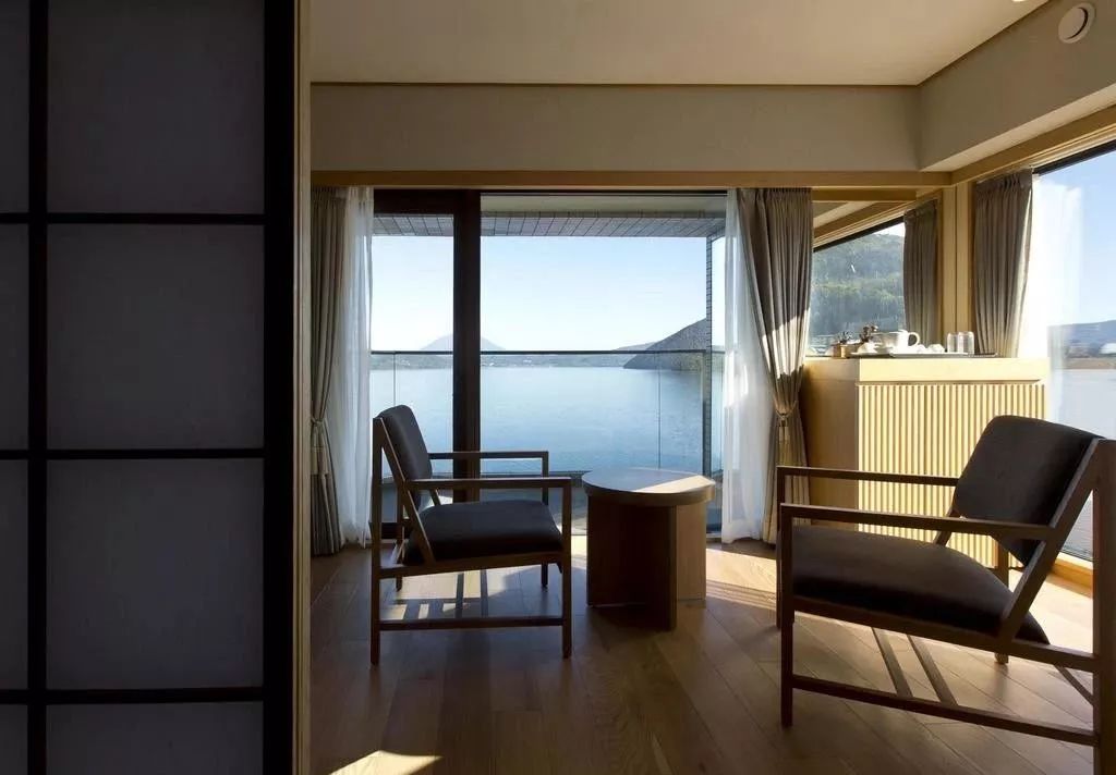 洞爷湖是北海道三大名景之一,位于寒带却是个不冻湖,一年四季都能看到宽阔清澈的湖水。沿着湖边有许多不同设计风格的酒店,乃の風是目前最热门的一家。酒店风格简约大气,落地玻璃窗的设计可以看见整个湖面。