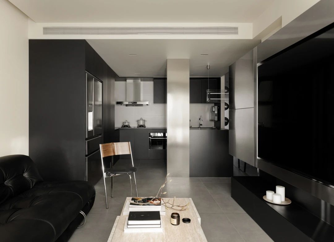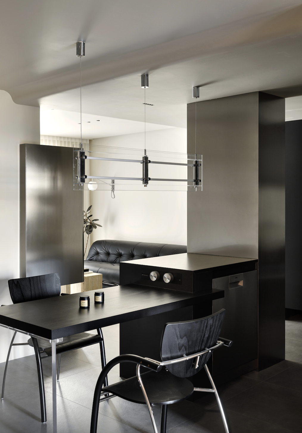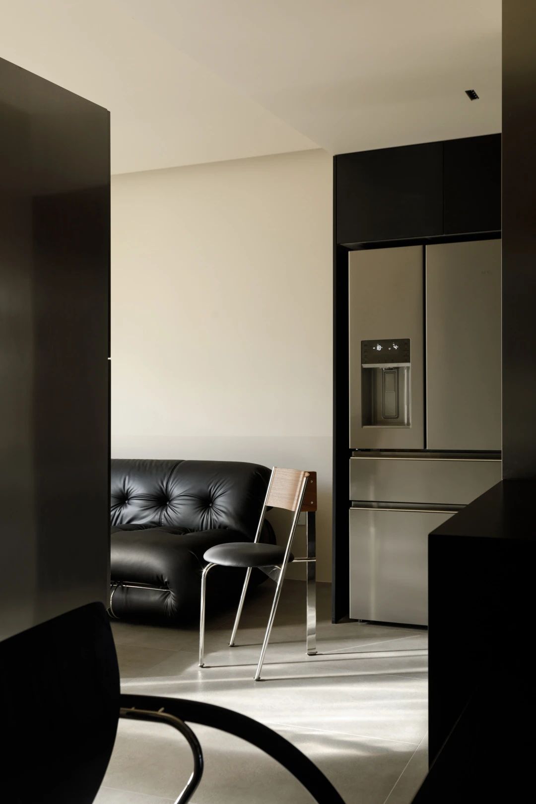 从客厅看向厨房,整个结构清晰明了,柜体全部采用黑色,管道利用不锈钢做了包裹,视觉平衡的同时也具备屋主想要的精致时尚感。