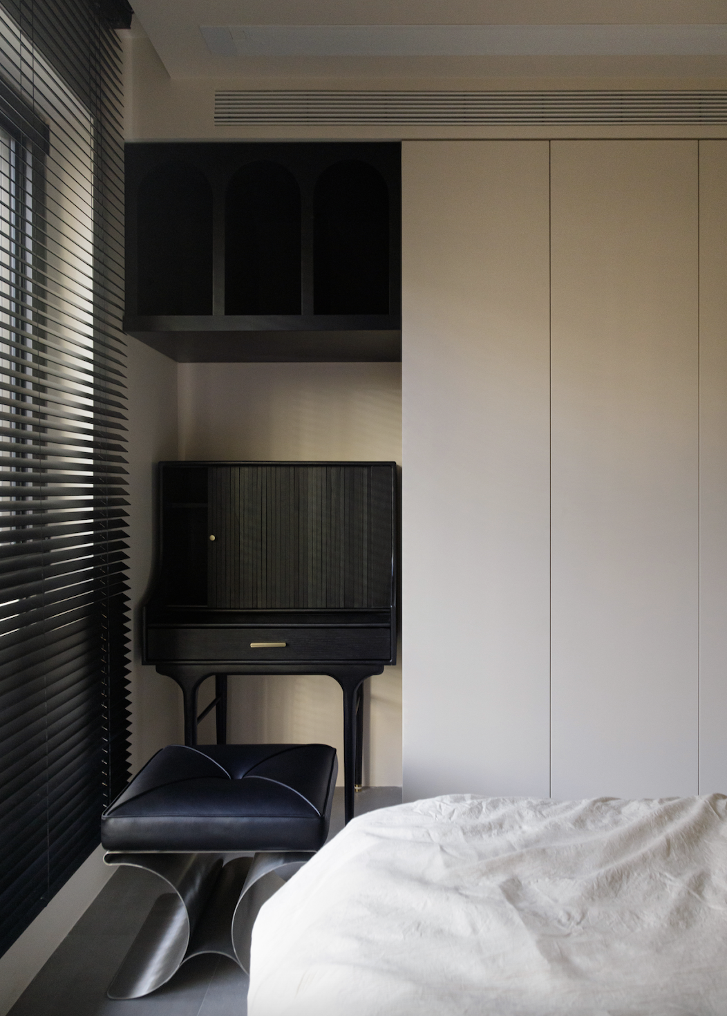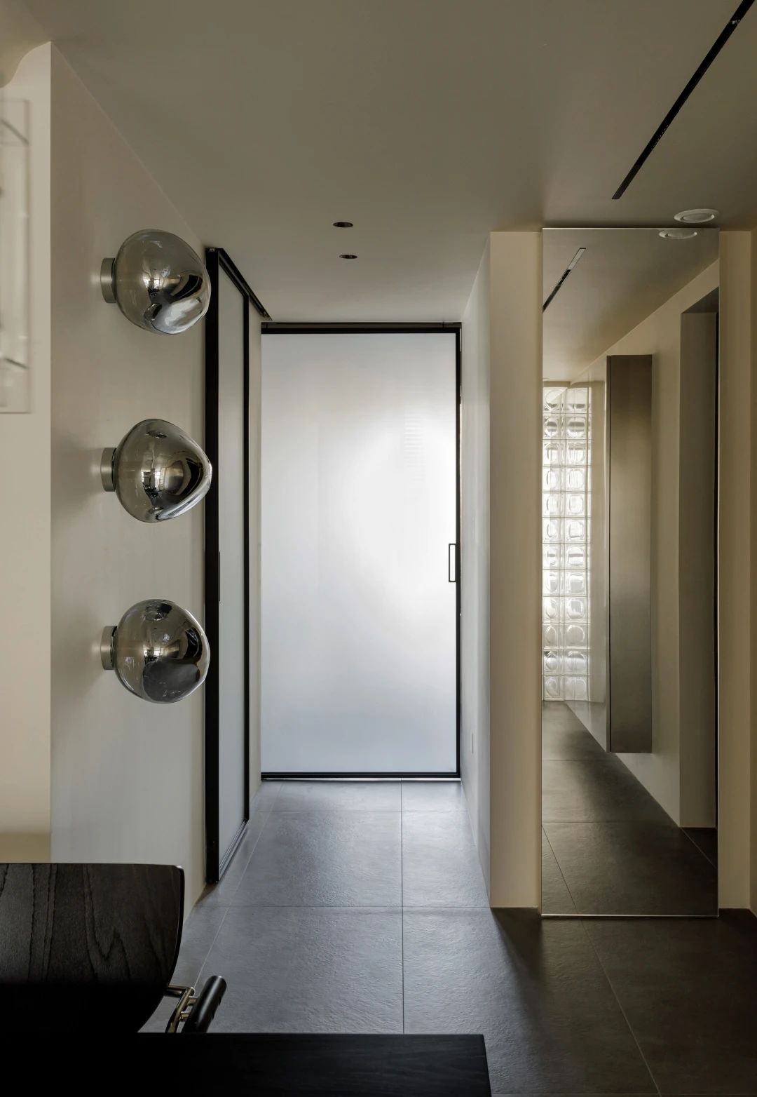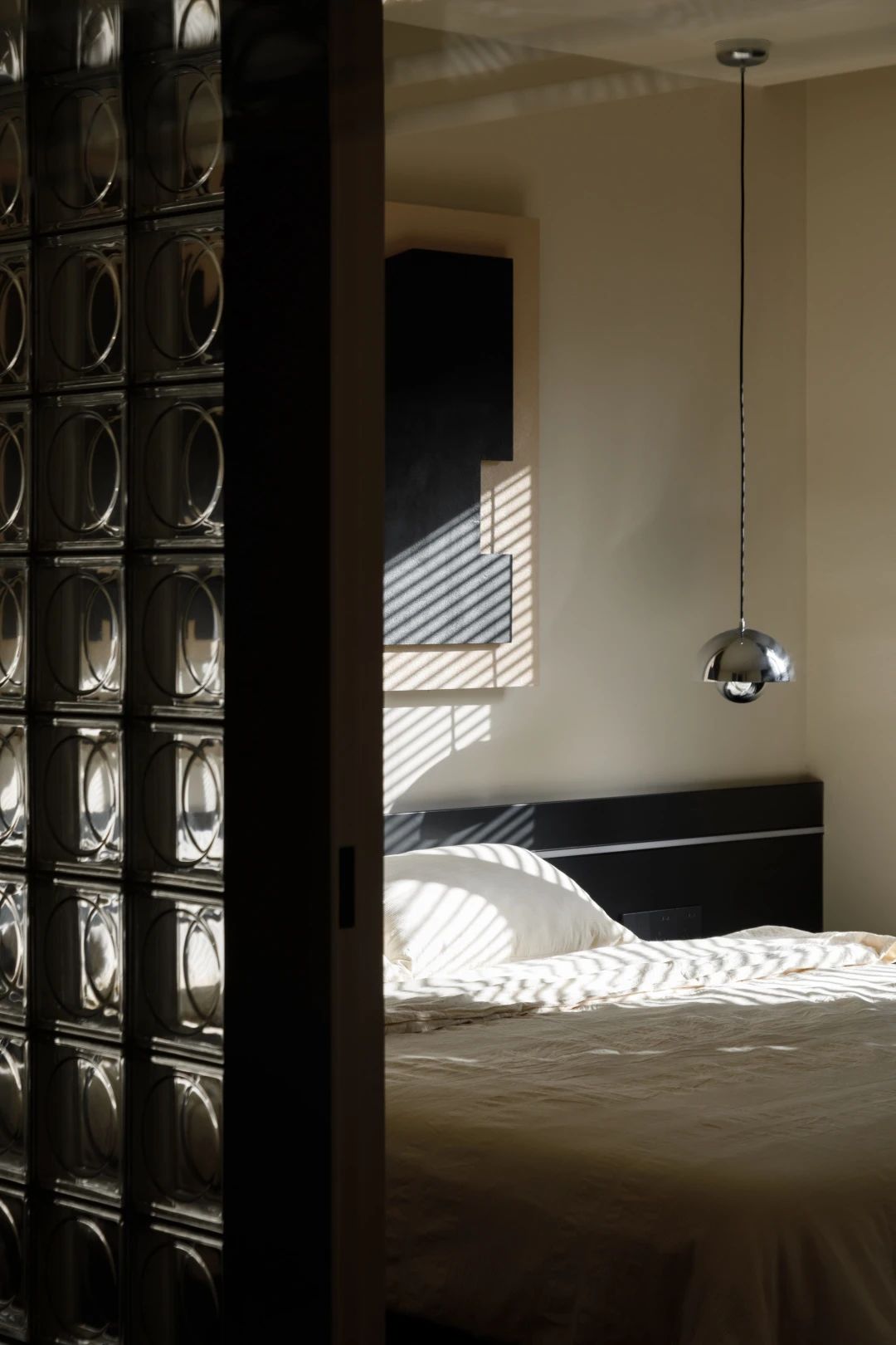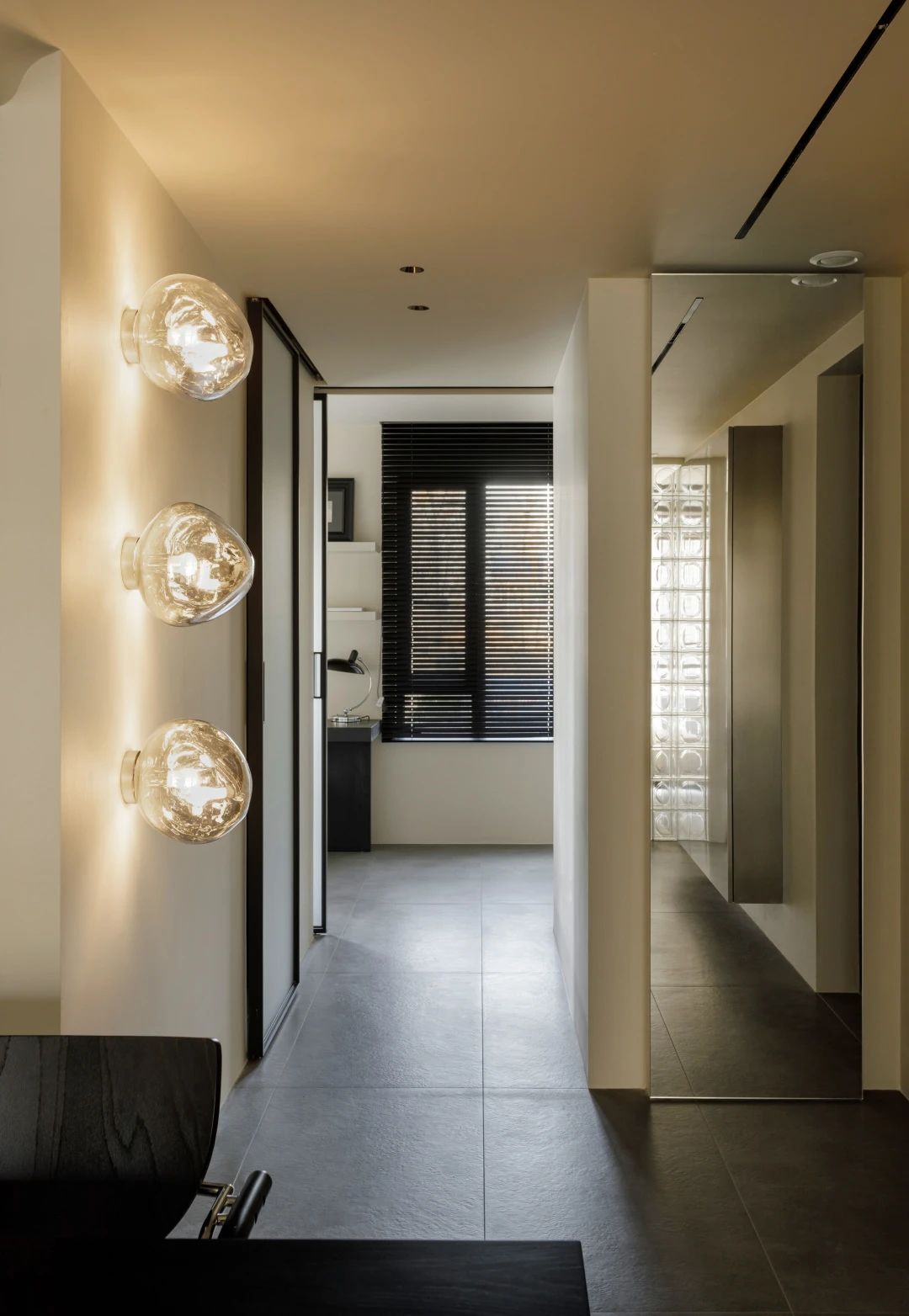 左手边过道通往北向房间,以玻璃门隔断,打开时增加房间的流动性,近处的灯光搭配尽头的黑色百叶帘,有种老洋房的既视感。关闭时则像个神秘落地窗,迎着光影产生光环,让人对窗的另一侧产生无限遐想。
