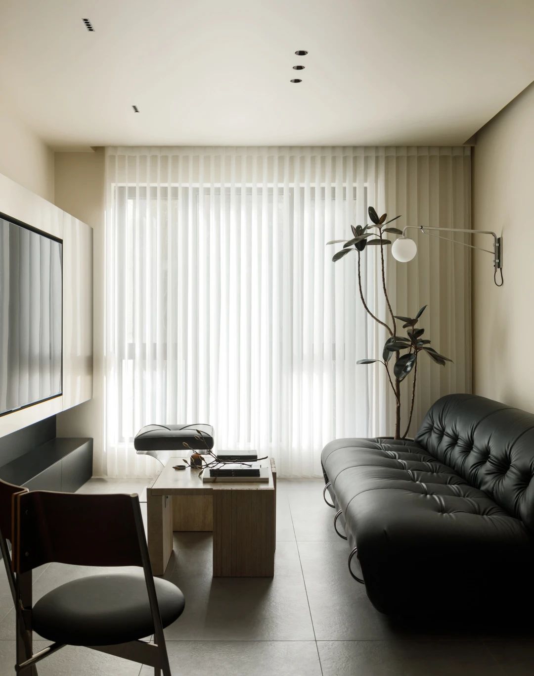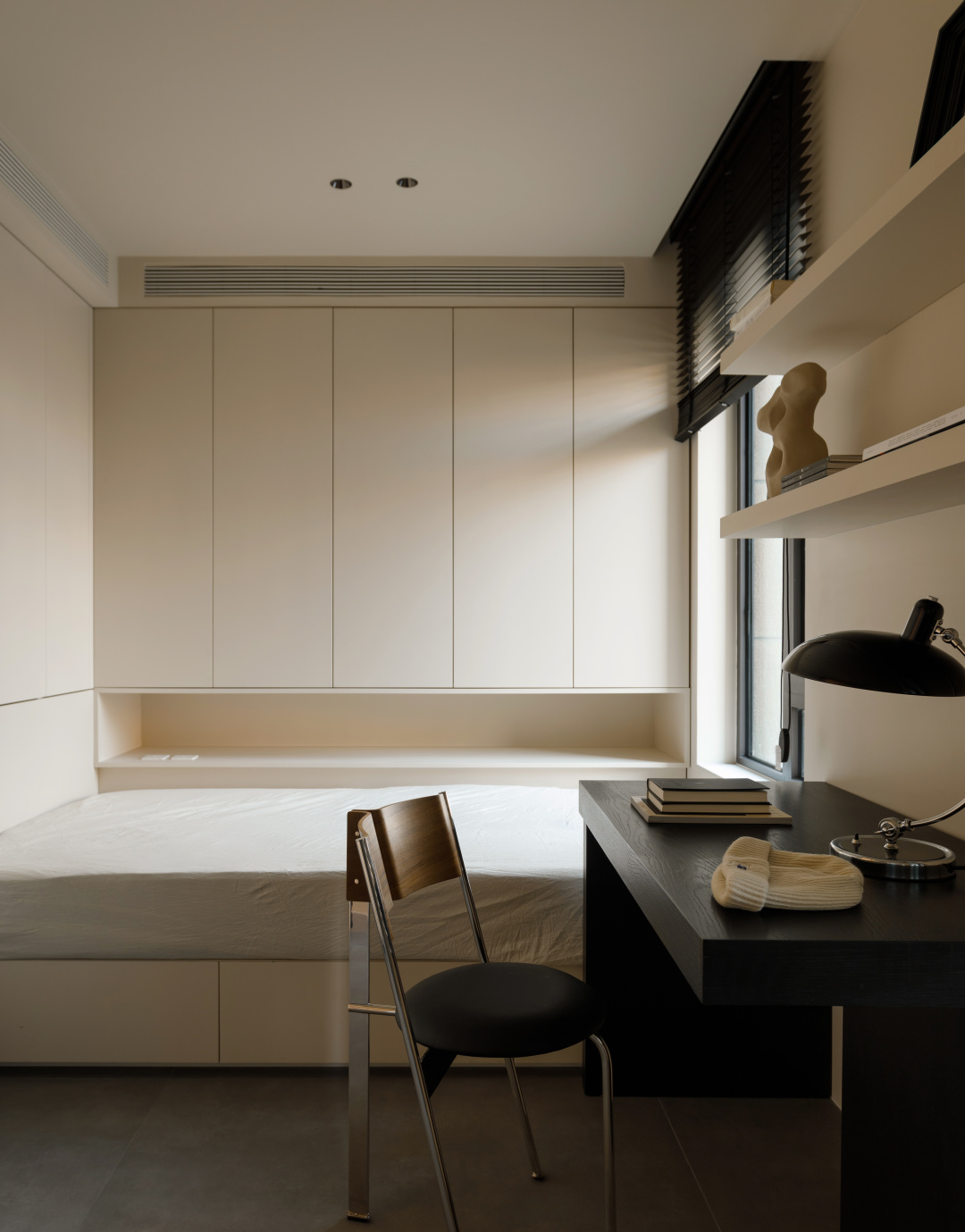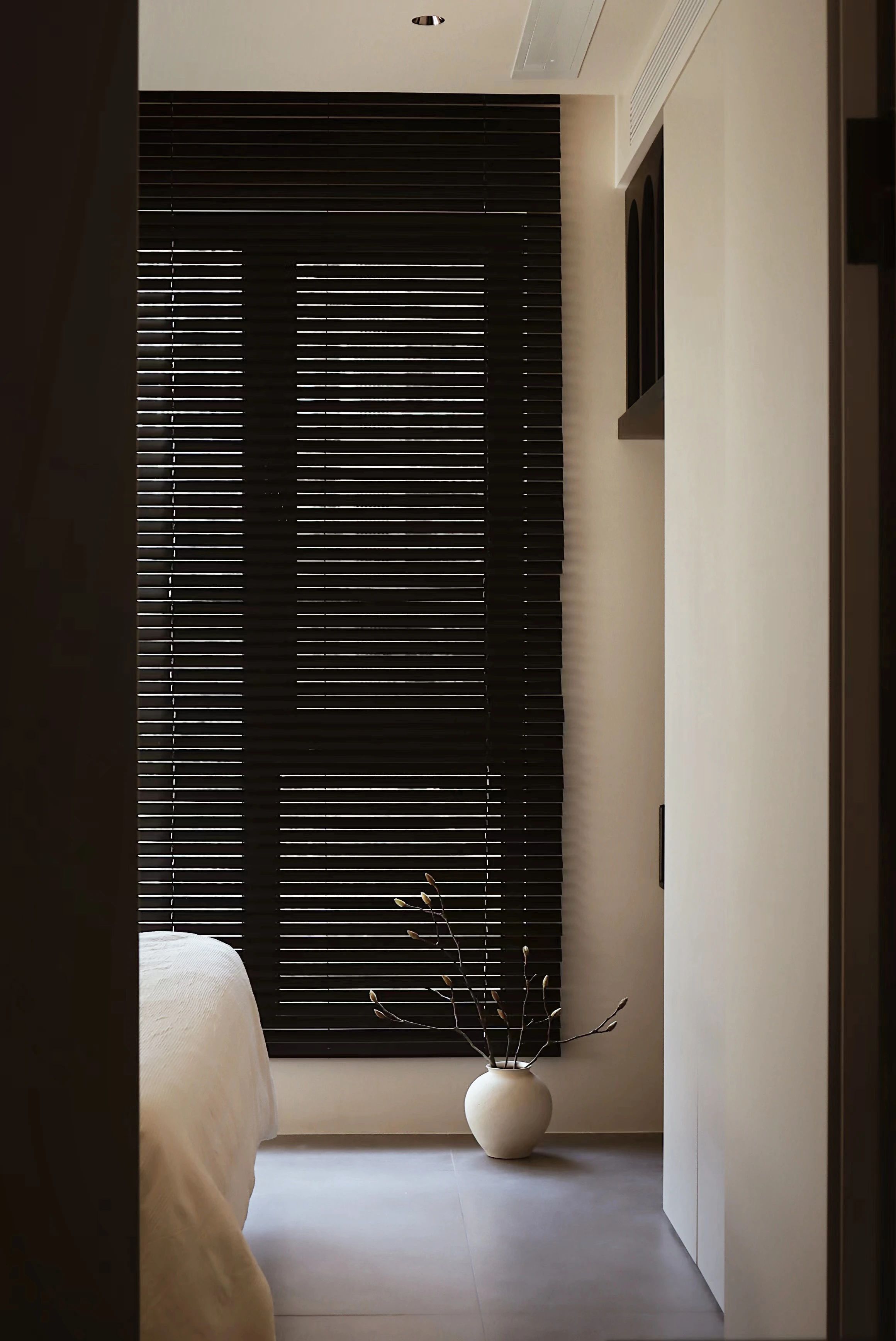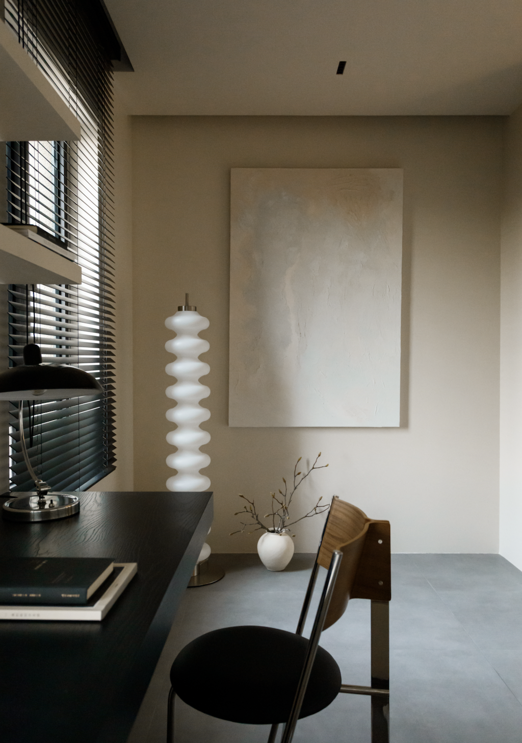 左手边过道通往北向房间,以玻璃门隔断,打开时增加房间的流动性,近处的灯光搭配尽头的黑色百叶帘,有种老洋房的既视感。关闭时则像个神秘落地窗,迎着光影产生光环,让人对窗的另一侧产生无限遐想。
