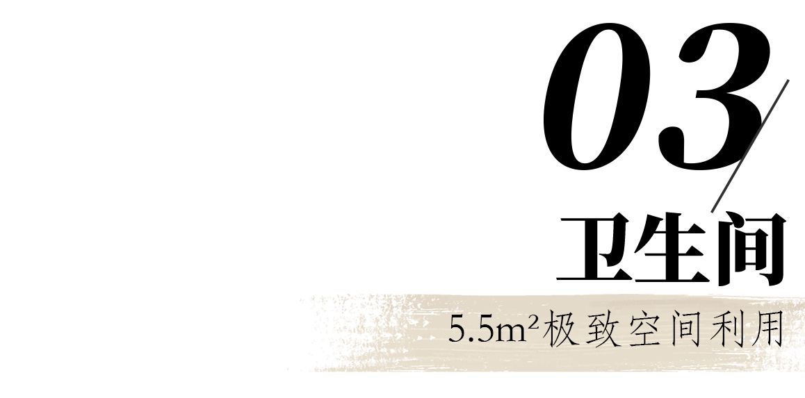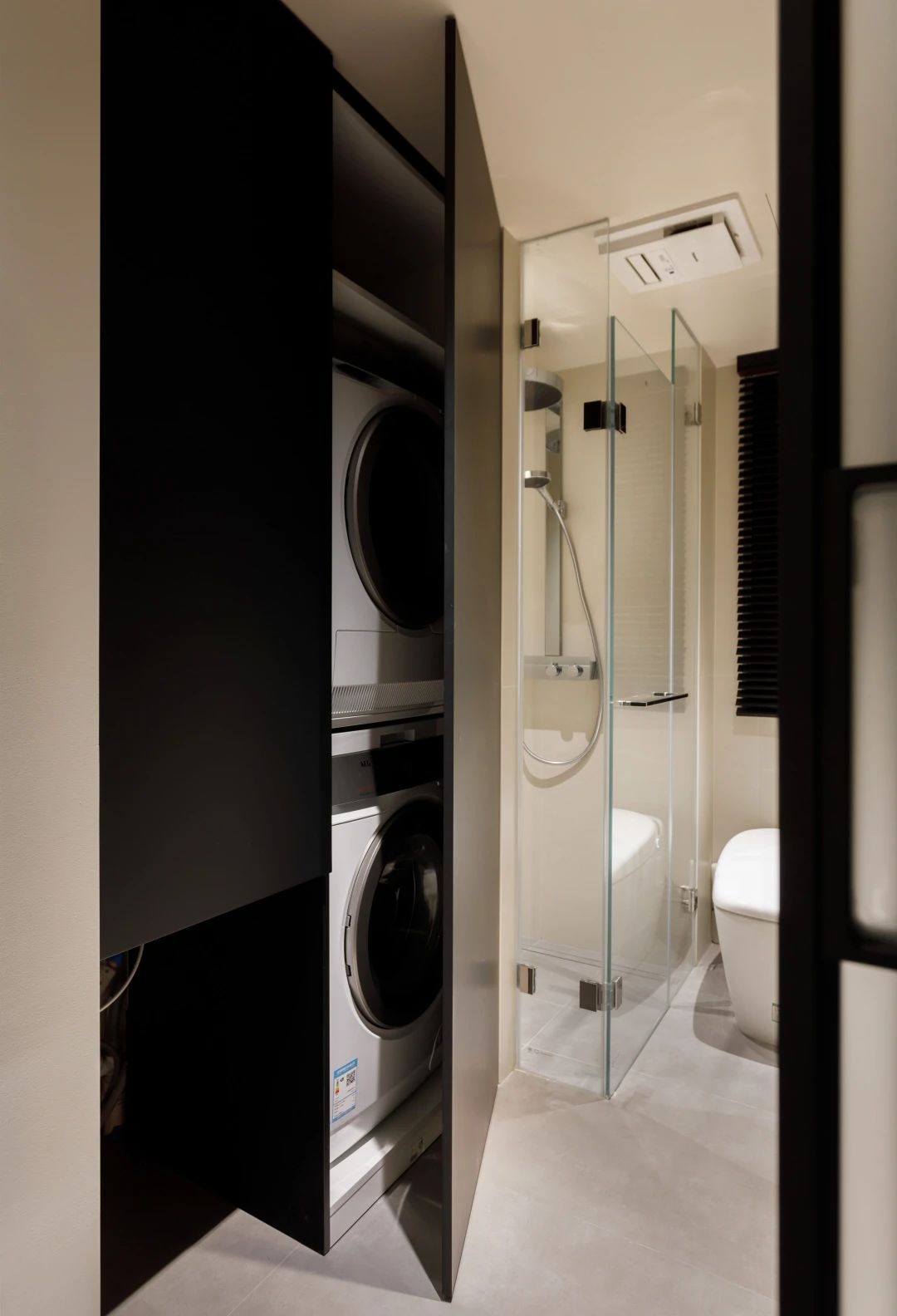 经过重新划分,卫生间最终保留了5.5m²的空间,设计师利用柜体、透明隔断、垂直收纳等方式将洗衣干衣机、mini洗衣机、猫咪厕所、淋浴、洗漱、马桶等所有功能区依次罗列,在有限的面积内将空间利用到了极致。