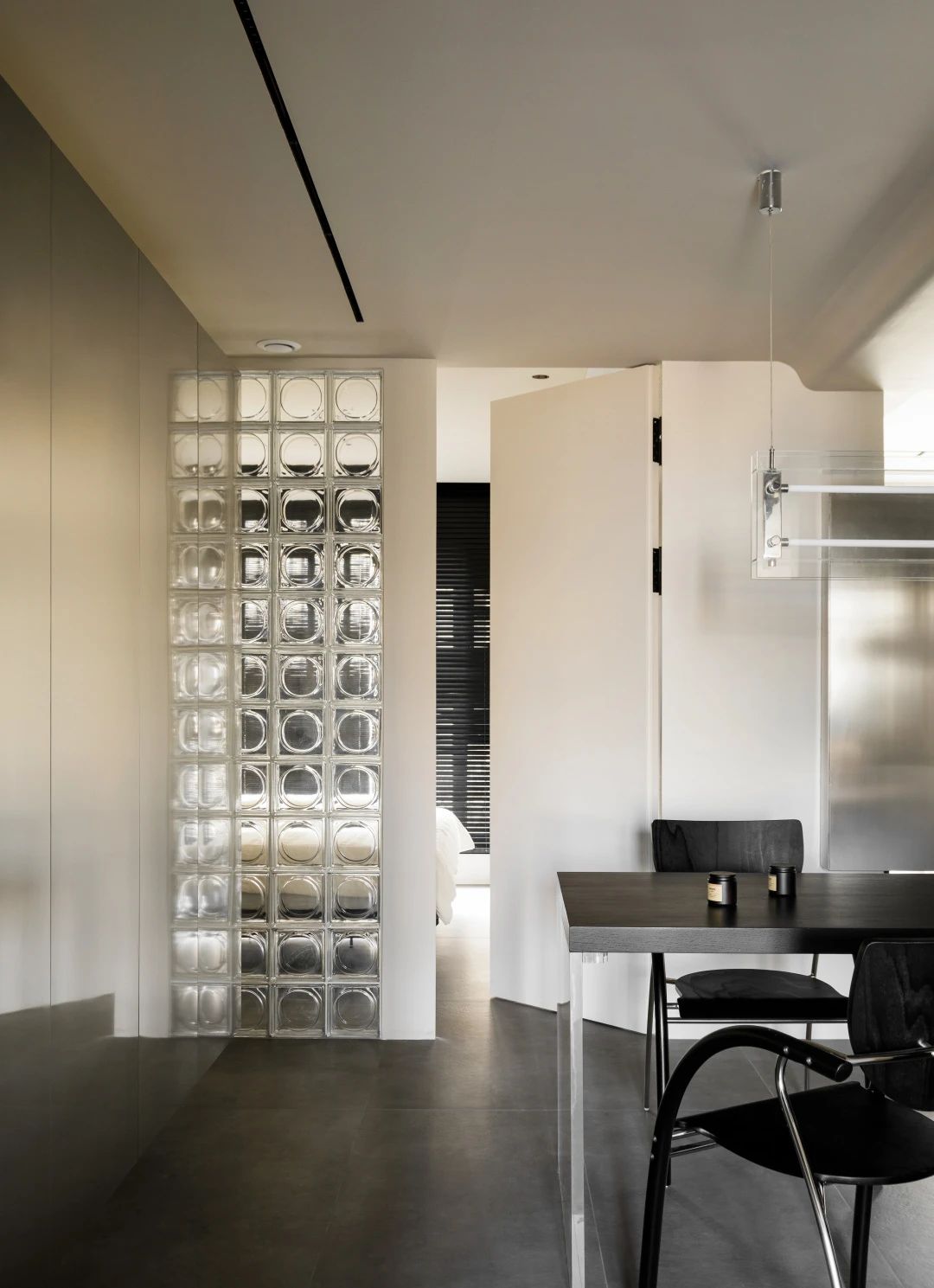 玄关的右手边通向主卧室,定制款金属材质鞋柜,与客厅的金属元素相呼应,让空间看起来更和谐统一,鞋柜一侧以玻璃砖“造墙”,让卧室引入的光线透过玻璃砖斑驳的映在不锈钢面上,让冷峻的工业风也流动着灵动的美。