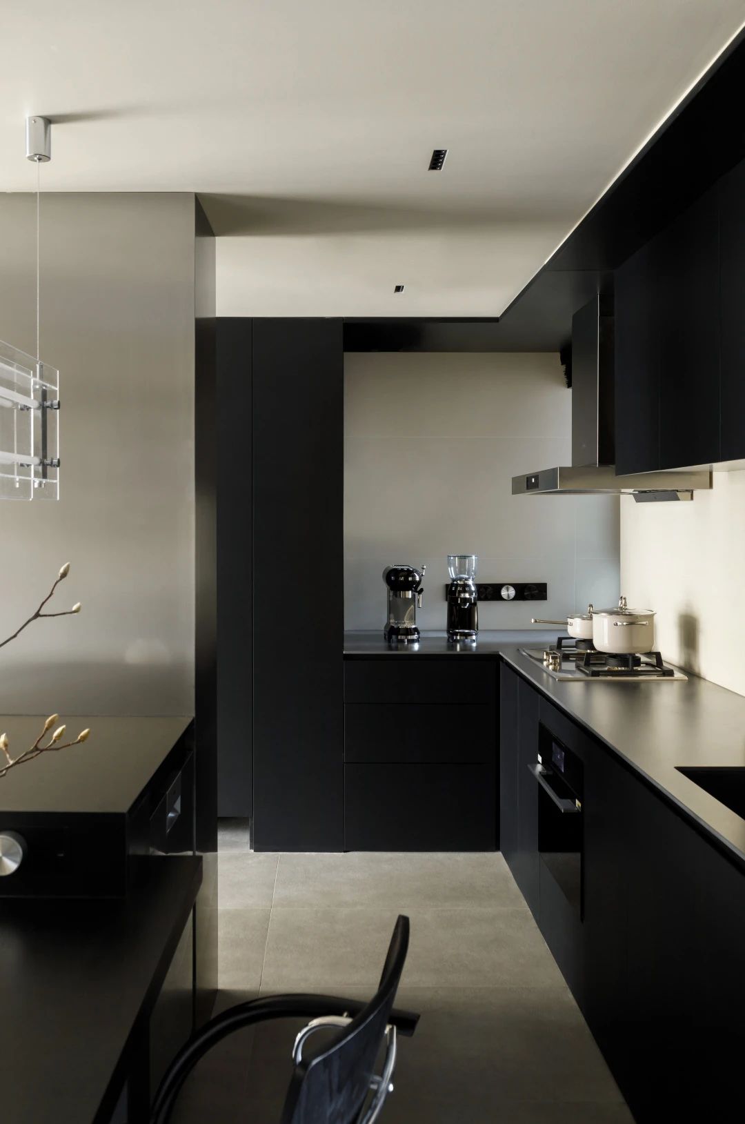 改造后的厨房台面有3.4米的长度,依次排列了冰箱、收纳、灶台、备菜空间…井然有序的同时也最大限度让动线合理化。地柜+吊柜的强大收纳面积,让台面可以简单利落,黑色柜体从顶到地的包裹,中间以乳胶漆过渡,理性中包裹感性。