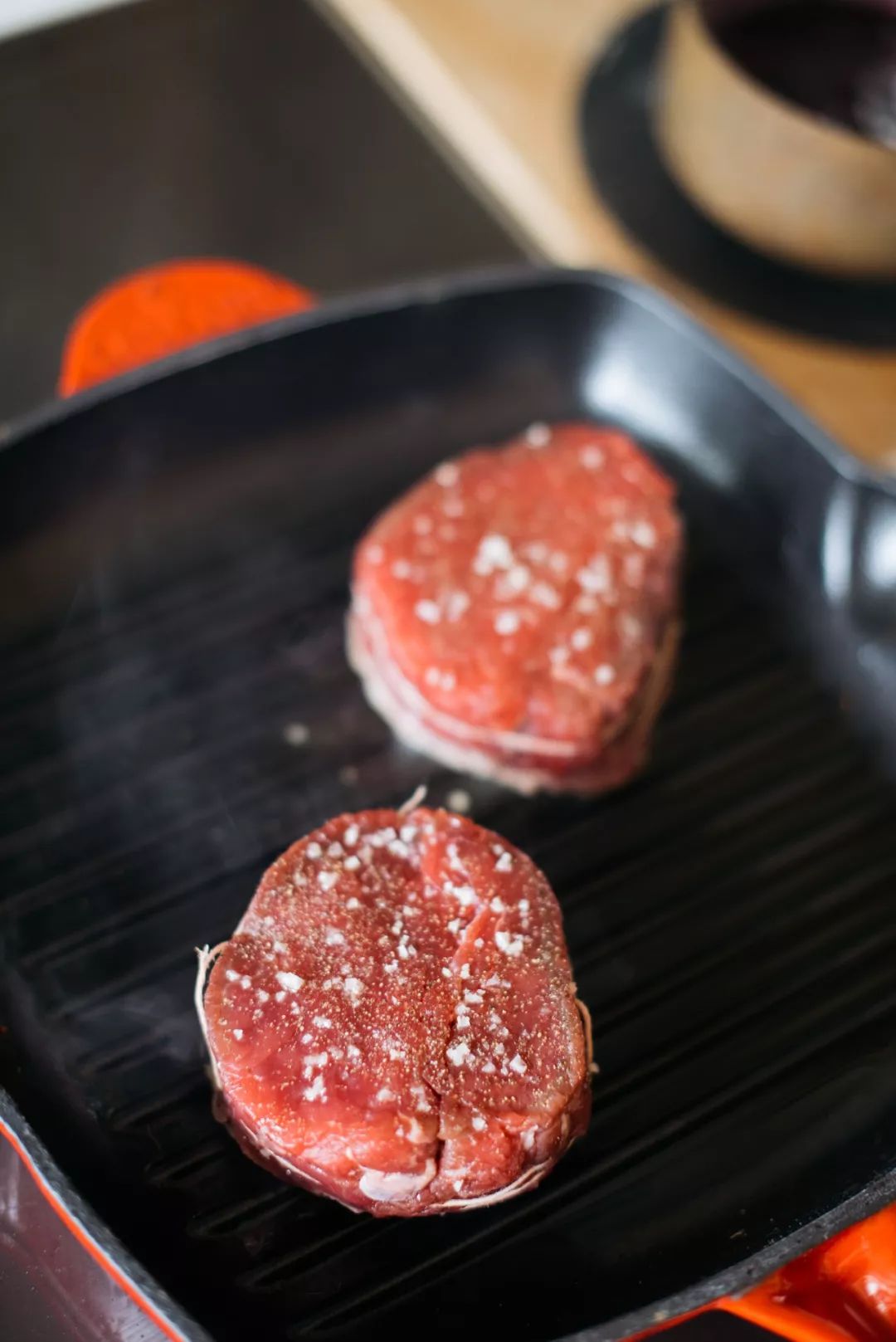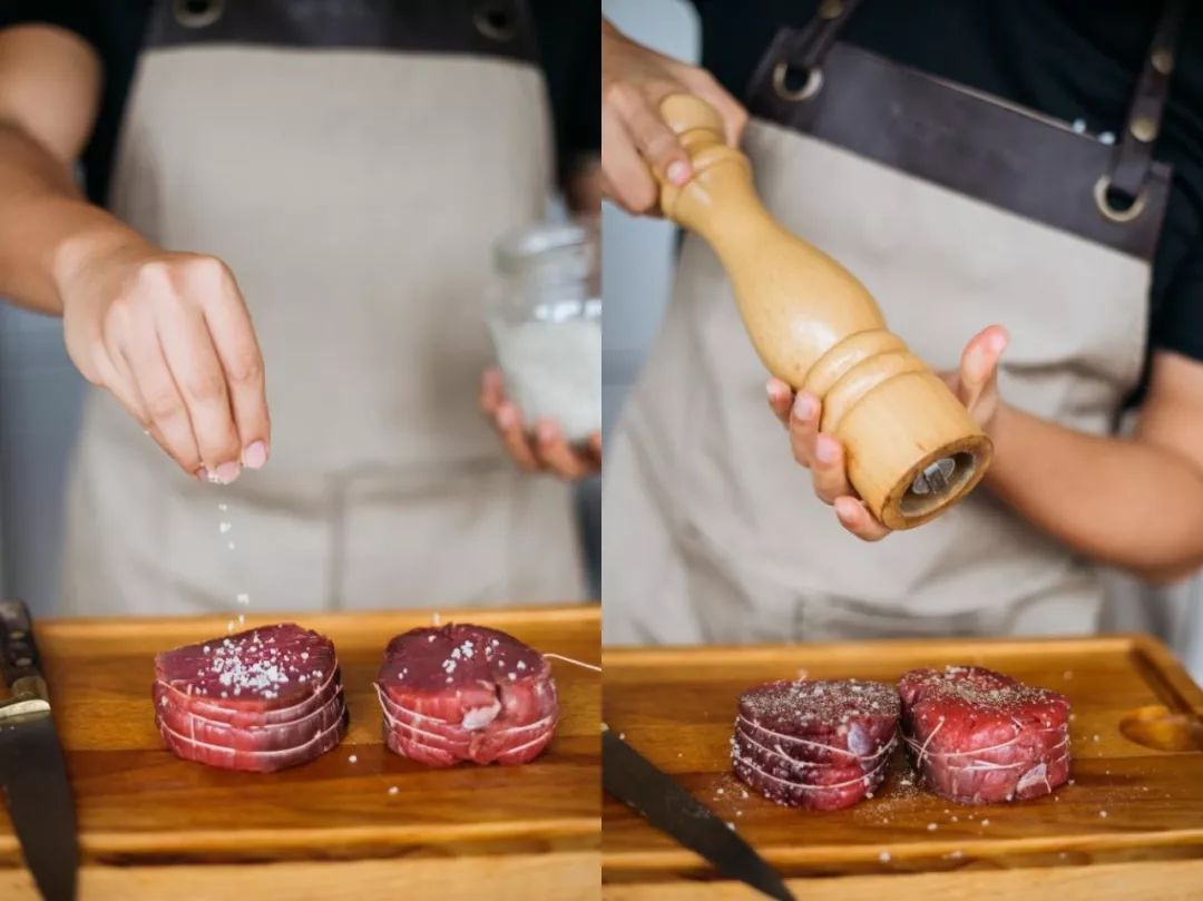 在早市肉铺买的牛排,抹上盐和黑胡椒。绑肉的棉线可不拆,煎的时候方便定型。煎牛排,要诀是高温恒温。 用方形牛排煎烤锅,铸铁的材质可以起到出色的传热,棱纹能增加锅底厚度让牛排受热更加均匀。 下锅时的呲啦声,说明温度够高,每一面煎90秒-120秒。