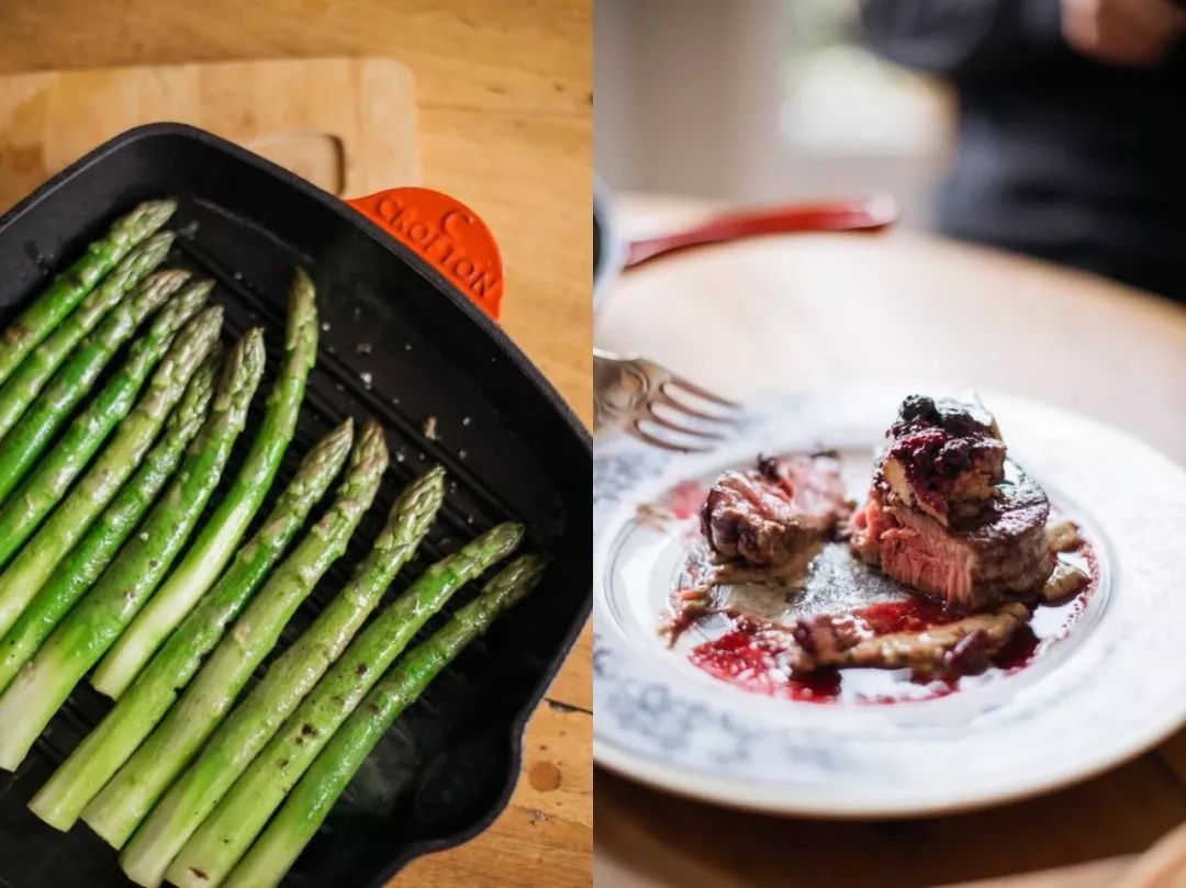 还可以用两个锅再做两道快手配菜—— 芦笋用煎烤锅煎扒,撒盐胡椒和柠檬。 蘑菇用平底煎锅炒,加盐和黄油就好。