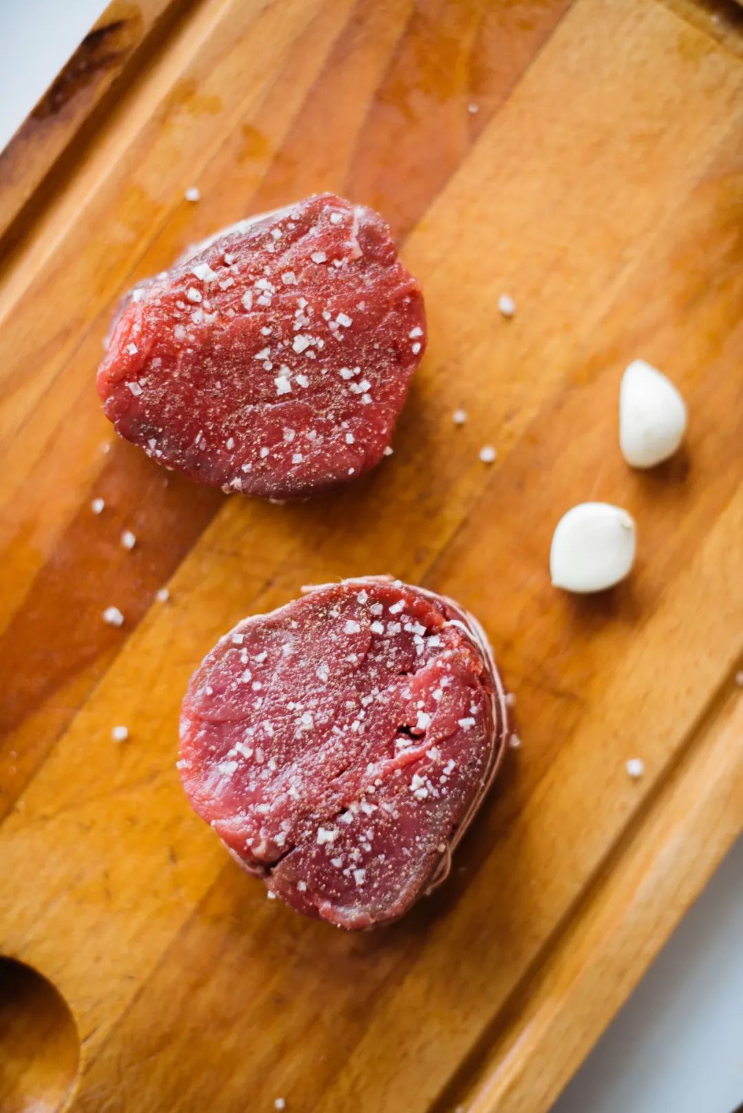 棱纹避去多余油脂,还能煎出格纹。两面煎好之后,把牛排立起来封边,加一块黄油,上色会更漂亮,也更香。煎好的牛排用锡纸包住保温,以内部余温锁住汁水。