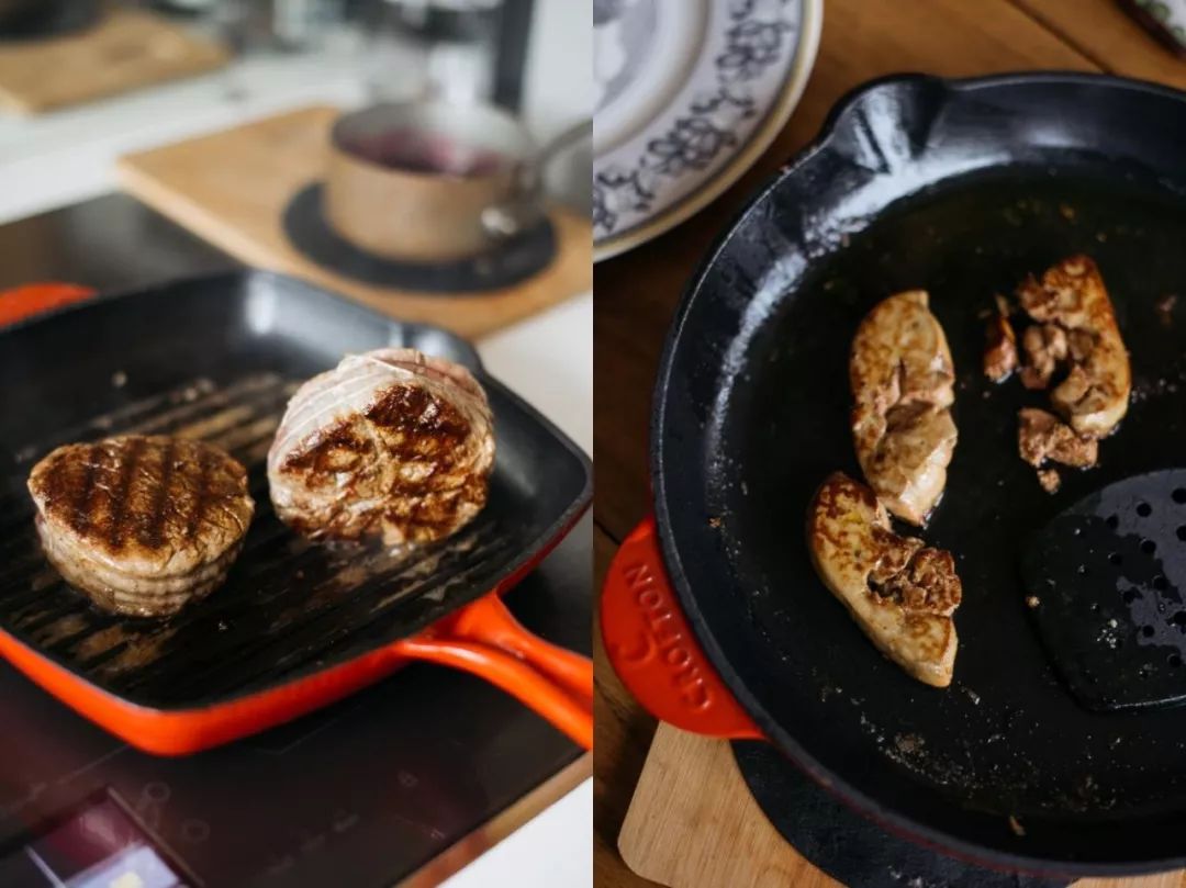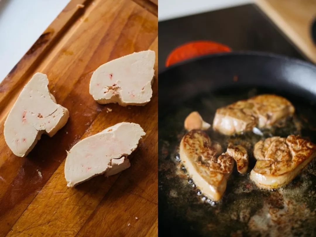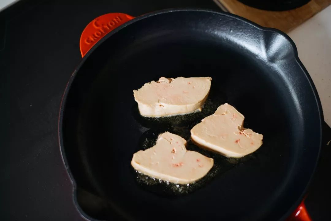 罗西尼牛排另一个必要食材是鹅肝,法国人对鹅肝的爱,不亚于我们对毛肚的感情。鹅肝厚切,直接下锅煎!如果买不到或者担心太油腻也可以省略(真香警告!!!)煎鹅肝用平底煎锅,导热迅速均匀,煎出来外焦里嫩。 用中火逼出鹅肝油脂,双面煎到微微焦黄就好。