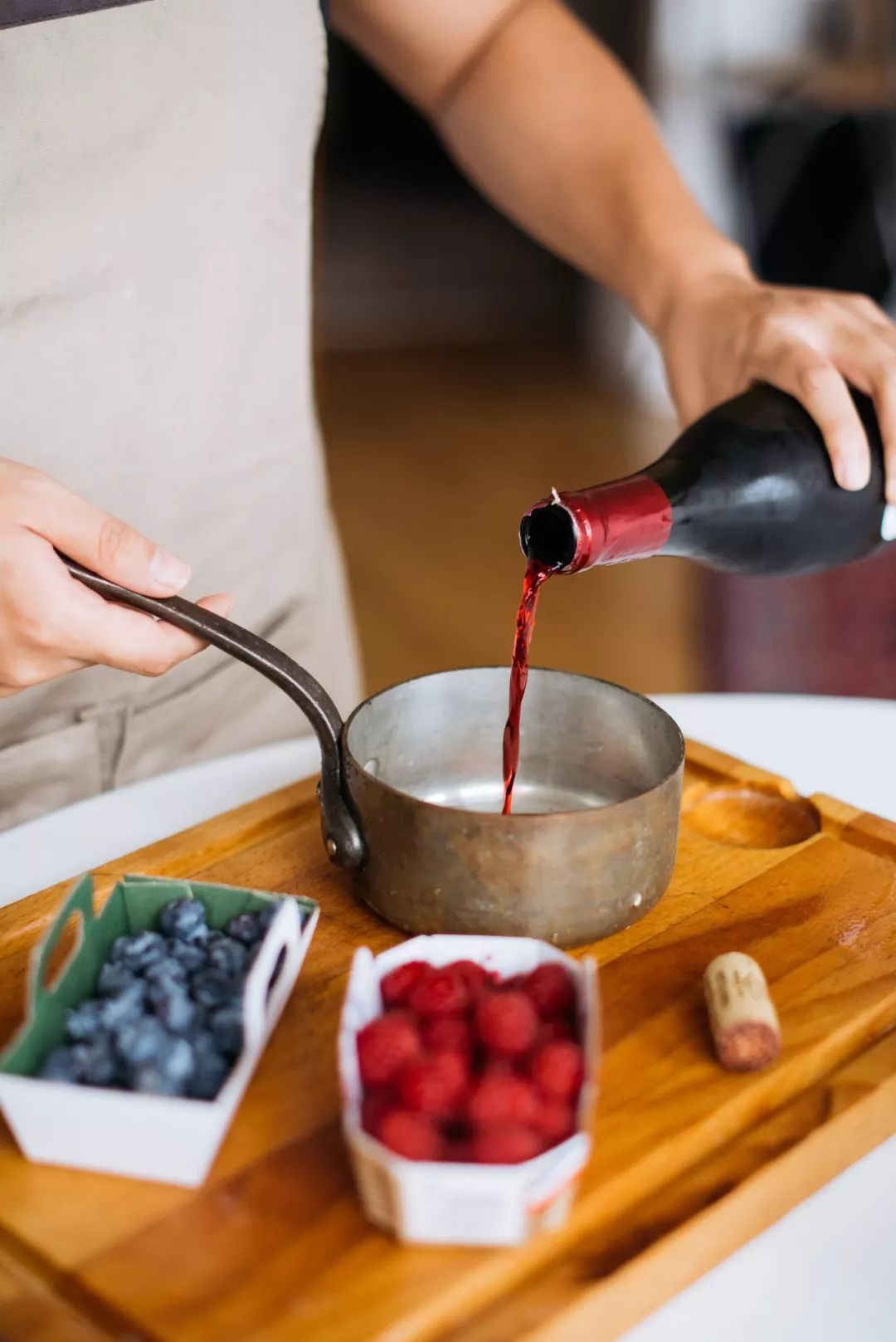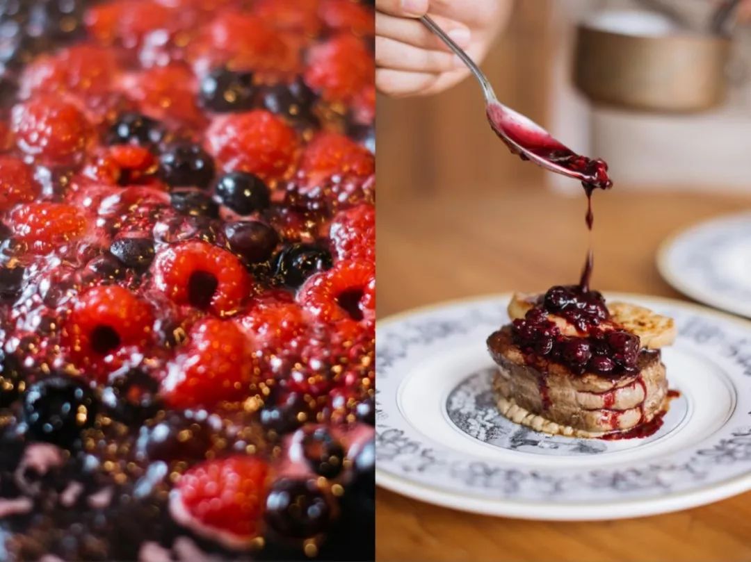 口的,我做一个酸甜的酱汁来平衡。选超市里最便宜的红酒,倒入一杯,烧开后蒸去多余酒精,加一勺白糖,放入红莓和蓝莓,收汁便成了浆果红酒酱。