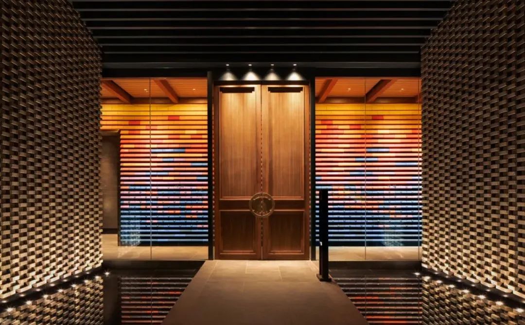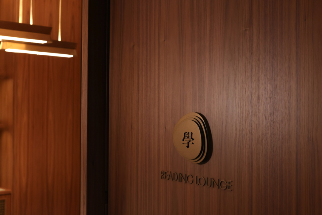 每个活动区的门板都设计了定制标牌,由带有中国字样的堆叠金属板制成,做工精良细腻。