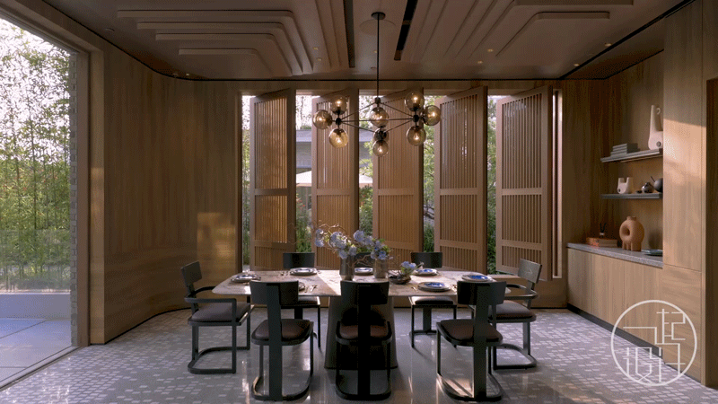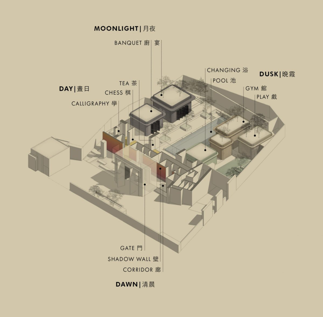 其社交设施以茶室为中心,在中央水池四周形成环绕路径,依次可到达象棋室、书法室、宴会厅、健身房和儿童游戏室等功能区。庭院布局灵感来源于传统围合式四合院