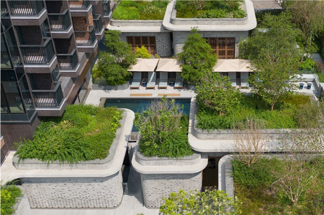 会所屋顶上方均留有植物生长发展的空间,实现夏季隔热、冬季保温的环保效益。