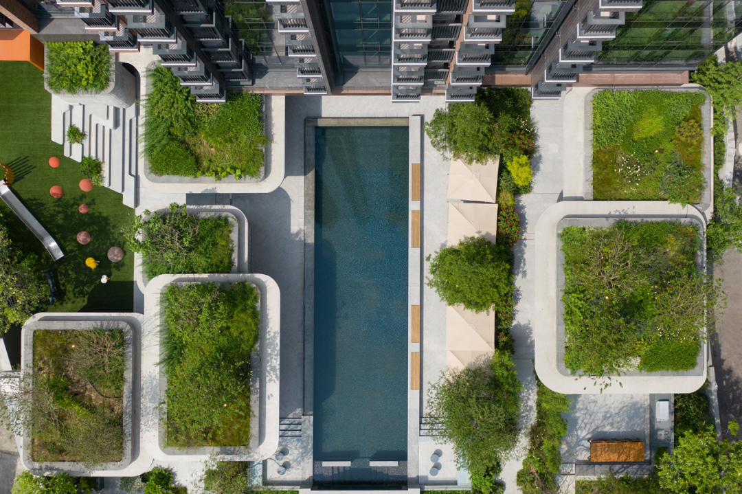 住客从上面的住宅往下看,可欣赏到由绿色植物拼合而成的“第五立面”,呈现生机勃勃的视觉张力。