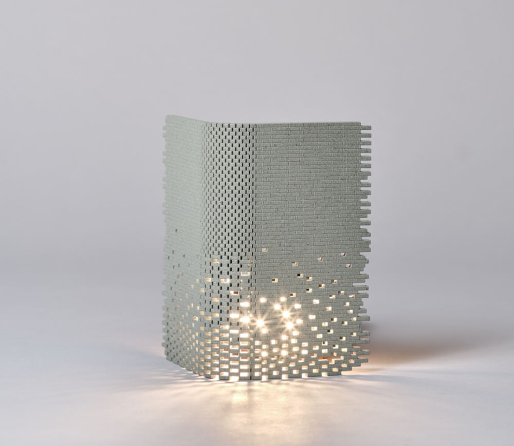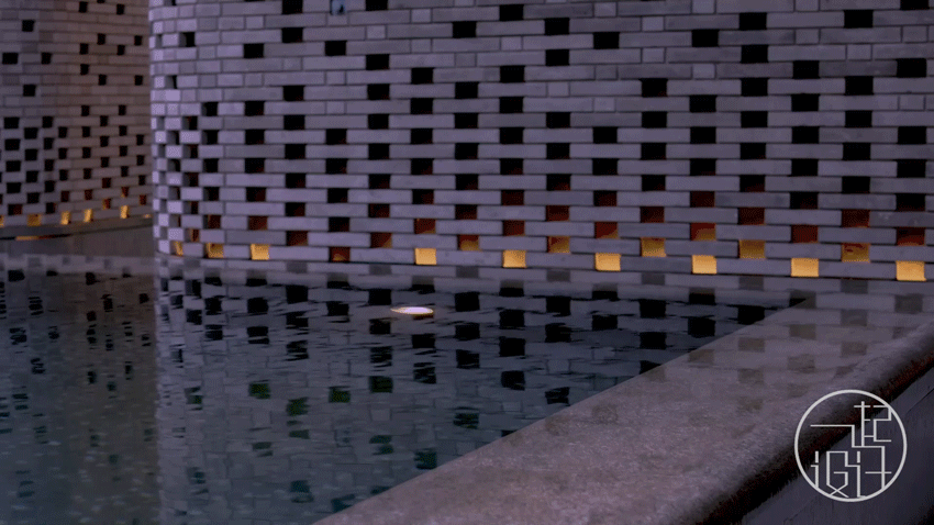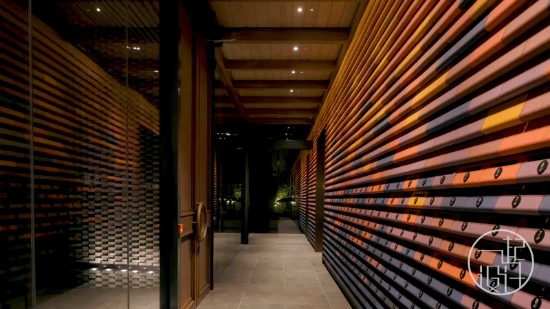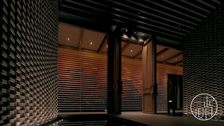 两侧手工制作的砖墙组成元素均经过精心旋转角度以形成涟漪般的视觉效果,在底部射灯照射下更显立体质感。