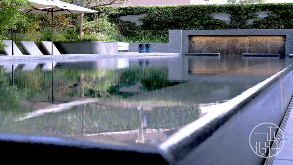 无边界水池与周围景致相互融合,另一端面向文化石瀑布装饰围墙,在顶部隐藏光映衬下质感满满。