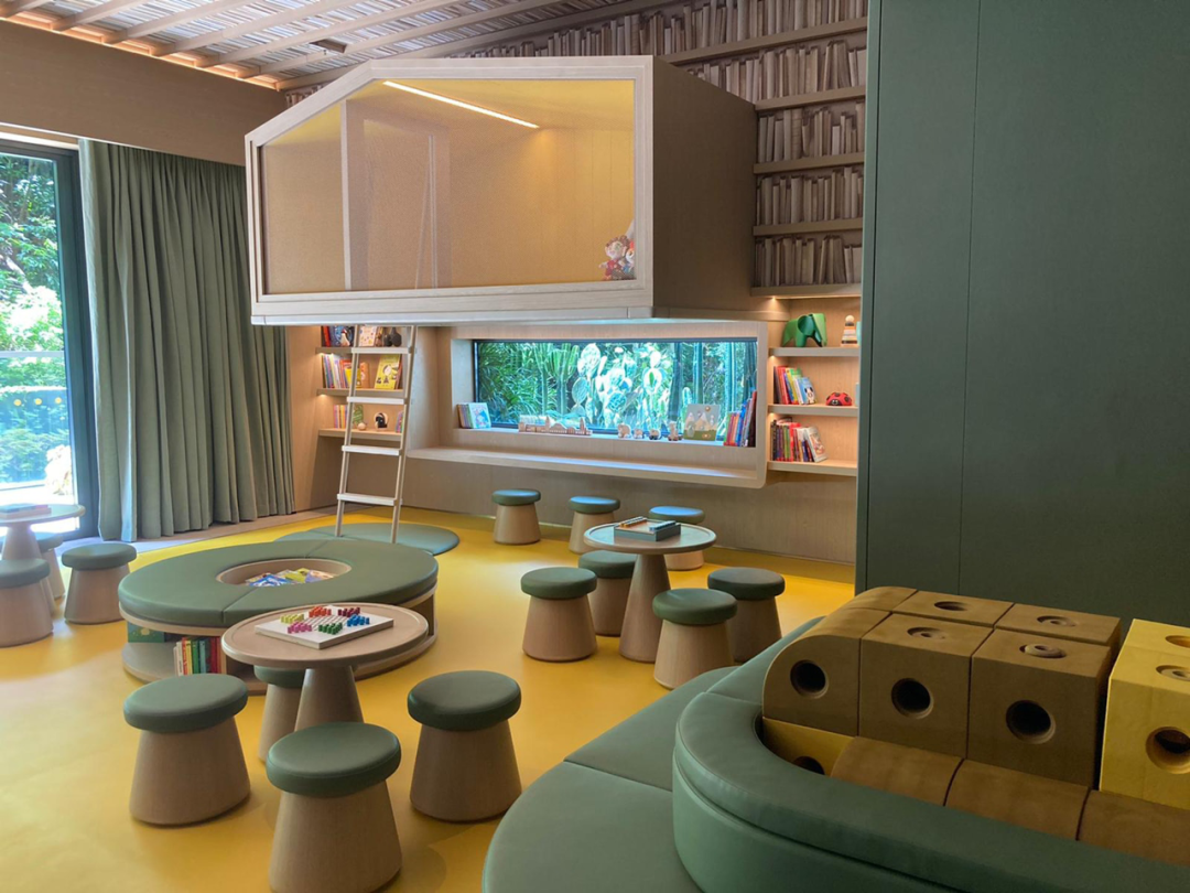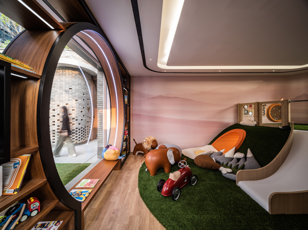 室内游乐设施一侧墙面安设圆形大玻璃窗,不仅引入充足光线,也与户外保持视线通透。