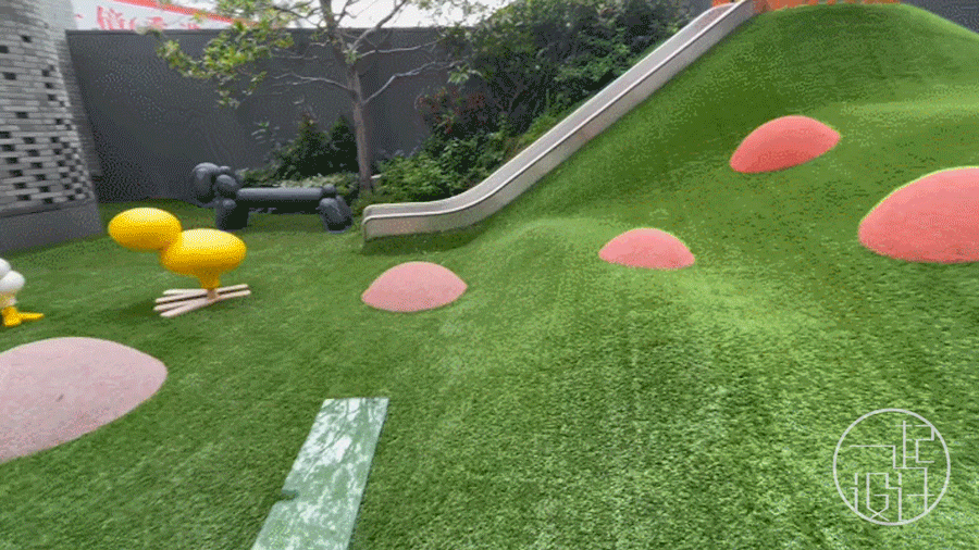 儿童区包含室内外玩乐设施,其中室外建设有一段起伏的攀爬草坡,一路通往顶部的橘黄框架内的秋千区。