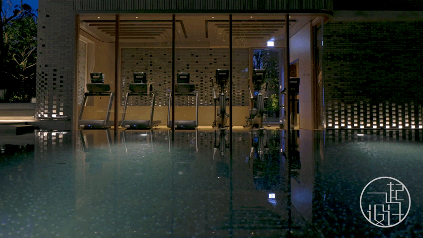 健身房墙面开设大片落地窗直接面向中央水池,为住户提供开阔的视野。