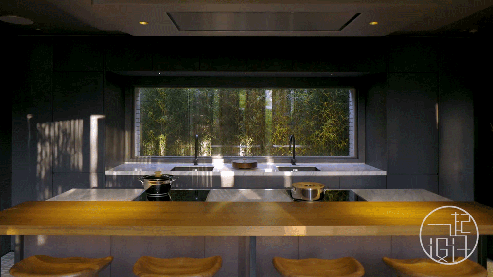紧邻宴会厅的开放式厨房朝向同宽的采光矩形窗,白色大理石操作台在周围深色墙面的衬托下更为凸显。