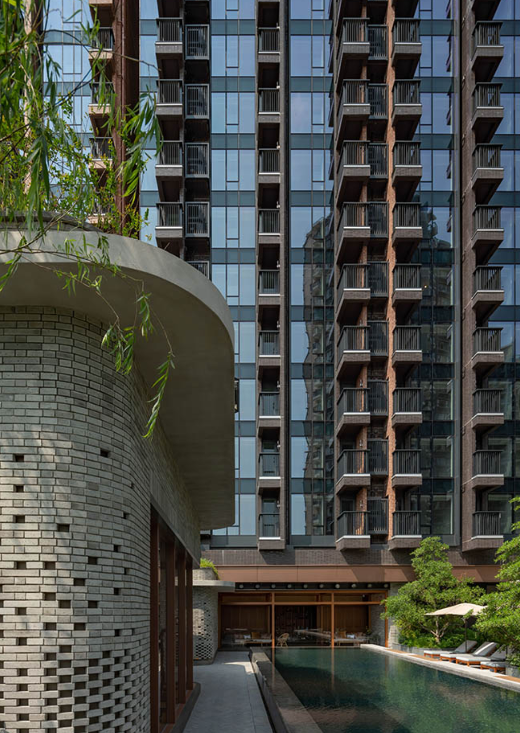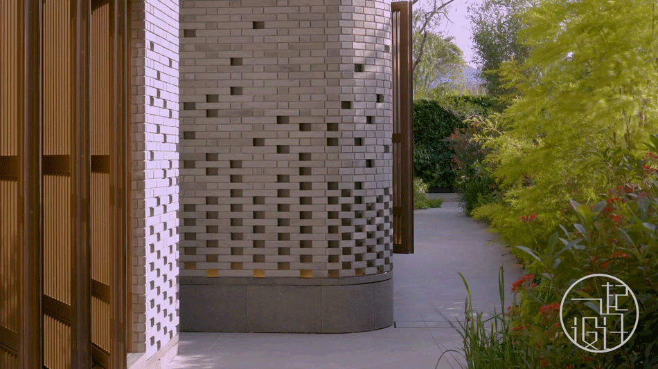 「颐舍」住客会所所在庭院的空间规划充分参考了传统四合院的围合式布局,受元朗古建筑的启发,以素雅古朴的青砖作为立面主材料,一系列砖砌“亭”围绕中央水池有秩序地展开,将中国传统建筑智慧糅合于设计当中。