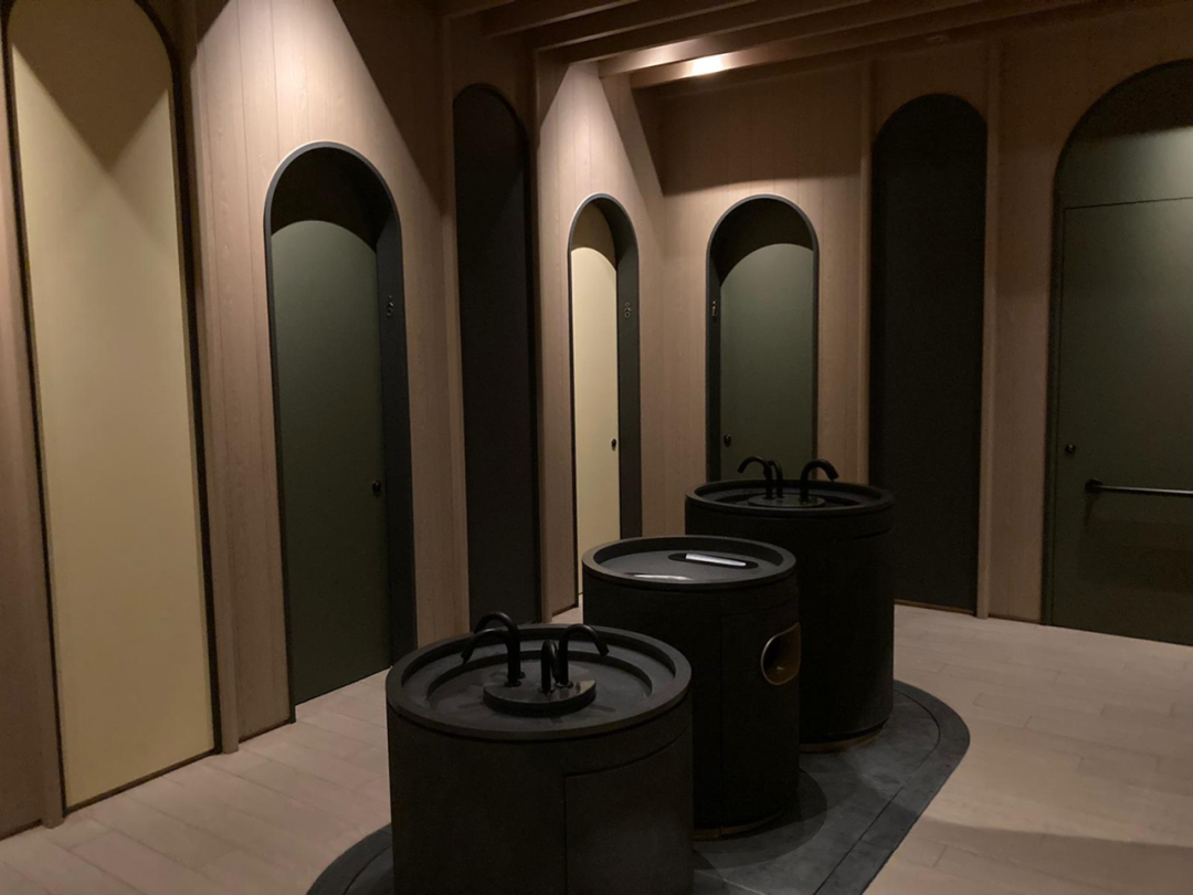 会所的公共卫生间选用活泼的拱形门元素,高低错落的洗手台同时满足大人和小孩的使用需求。