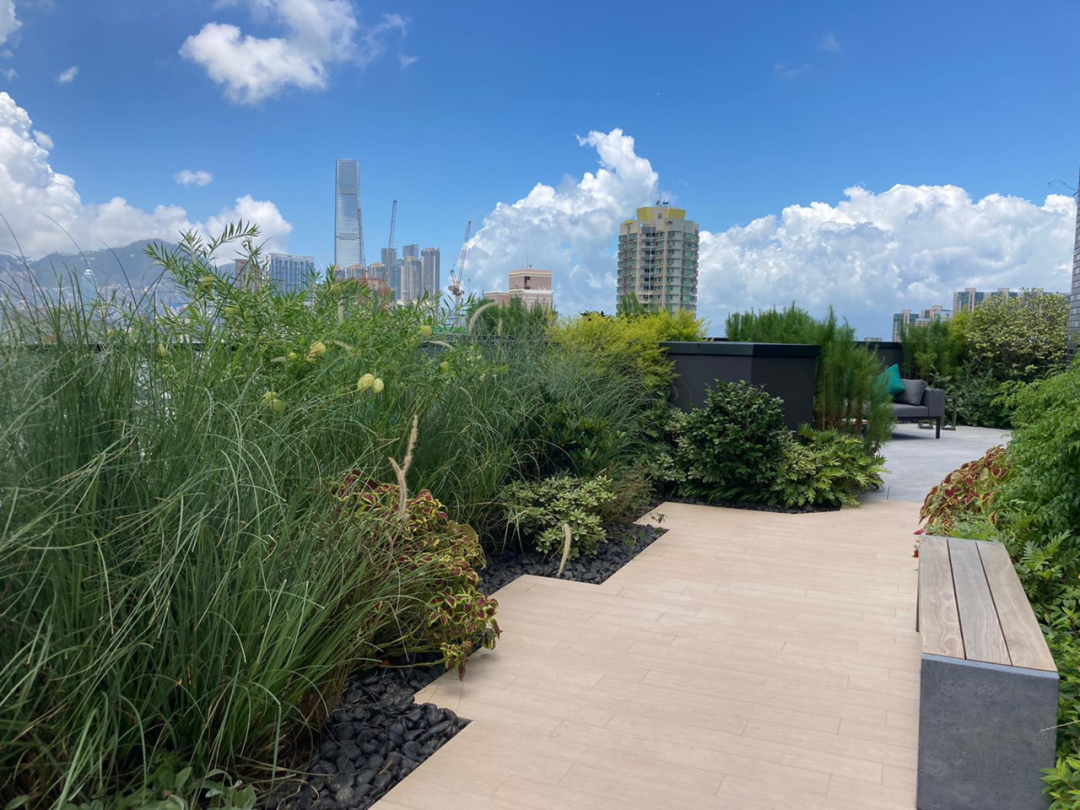 除了地面生机盎然的中央庭院,住宅楼顶部还设有一个植物种类繁多的屋顶花园。
