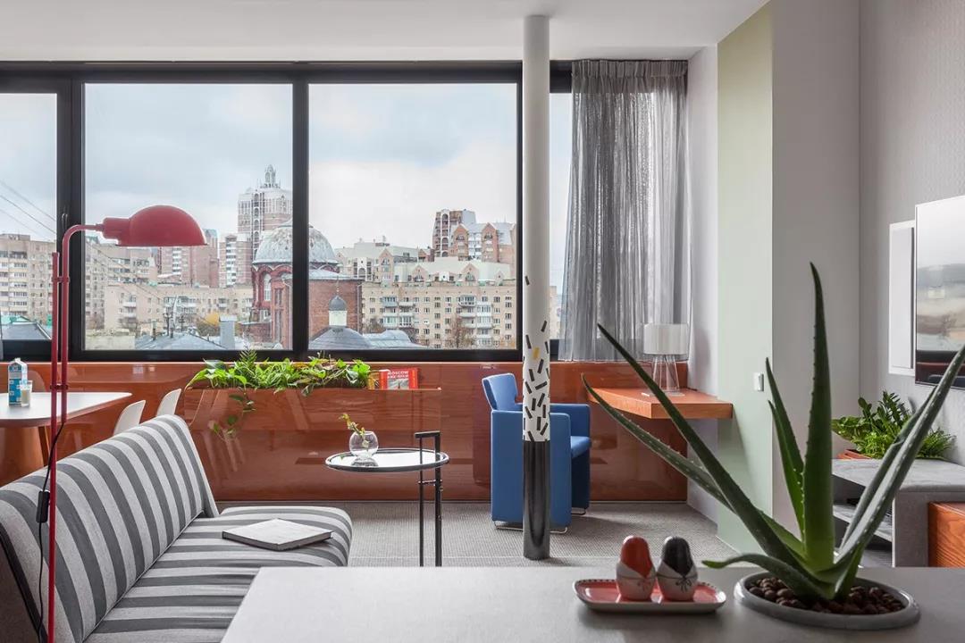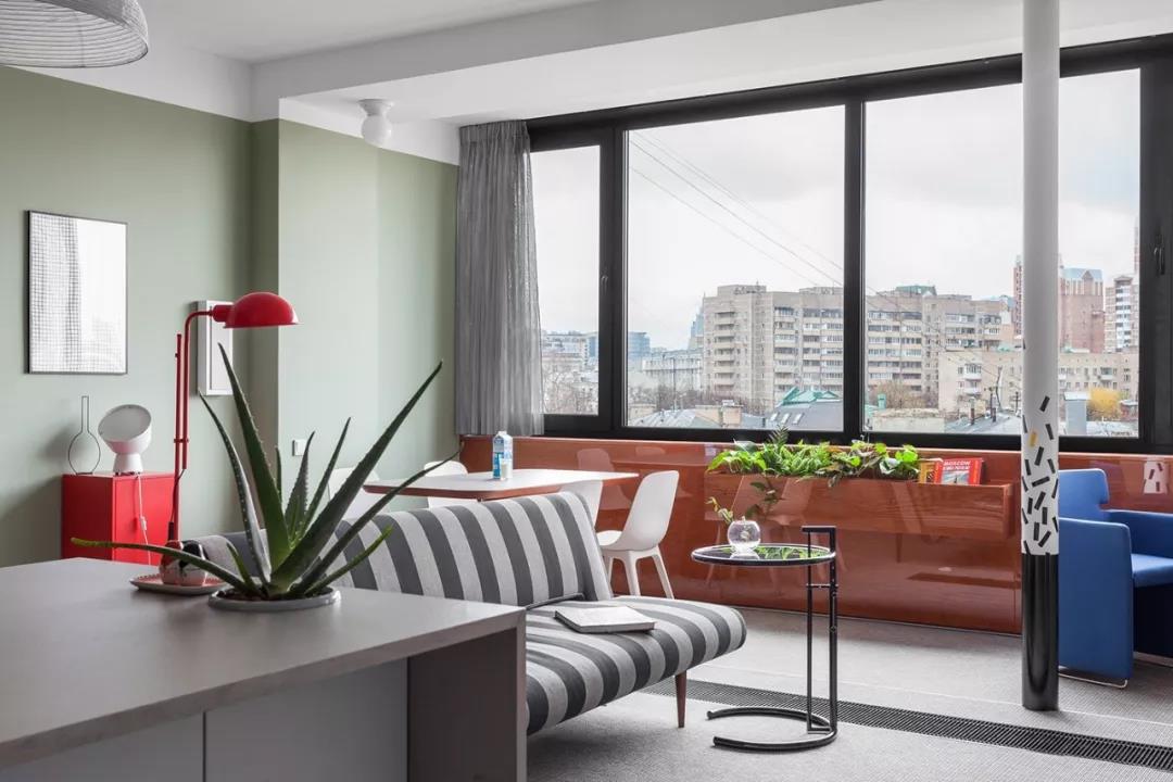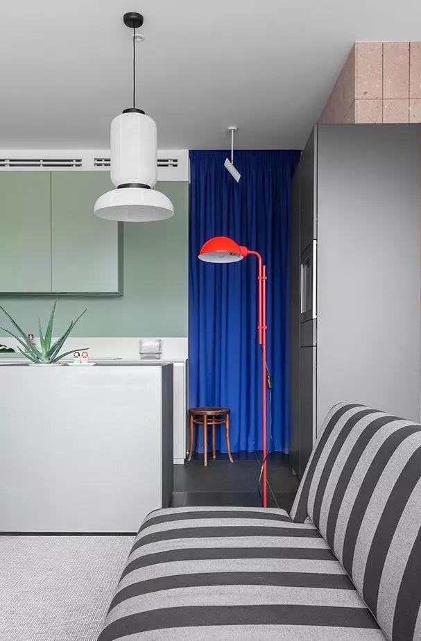 穿过灰色的帘子就来到生活区域,客厅的设计保留了 70 年代的浪漫风格。大面积的窗户,保证了室内的采光还能看到莫斯科市中心的景色。虽然整体空间不大,但生活氛围很好。