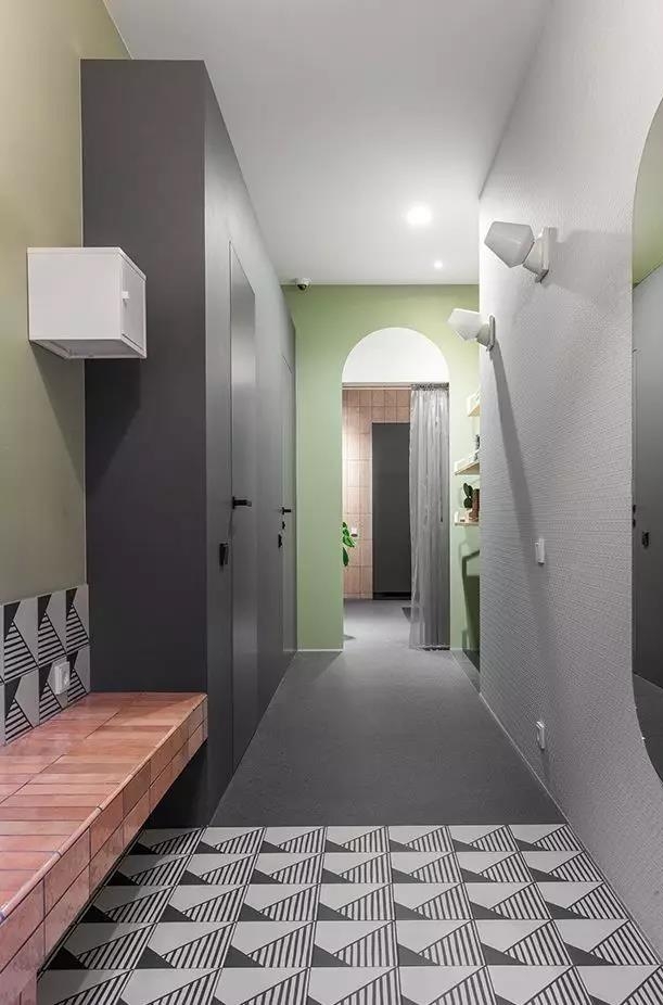 玄关入口以绿色、灰色为主地面铺了黑白几何瓷地砖,一张换鞋凳靠墙摆放铺着深浅不一的橘色瓷砖,十分好看。黑色的金属挂钩可随意挂帽子、外套、雨伞等物品让出行变得更方便。