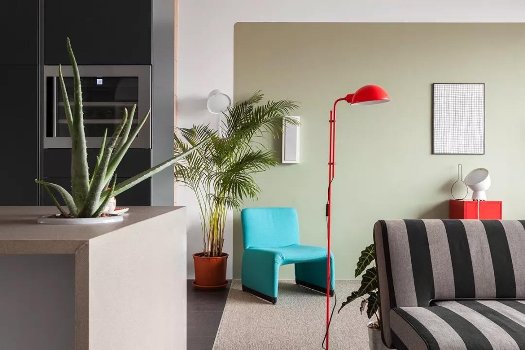 沙发边的橘色落地灯与后面的红色储物柜相呼应,个性十足的装饰画、简约大方的台灯搭配上蓝色的椅子和绿植多了很多趣味。