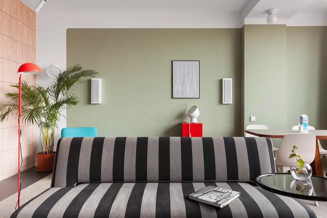 条纹沙发摆在中央位置做为隔断使用搭配上黑的边桌很是实用,绿色的背景墙也充满了活力。