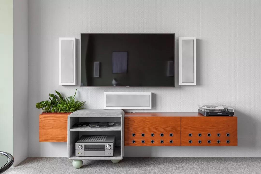 电视背景墙上贴了灰色壁纸挂壁式电视机与组合电视柜搭配很有造型感,将阳台打通与生活空间相连利用颜色、材料和地面分割区域,窗台边特意打造的花坛像是为窗外的城市打造的前景。