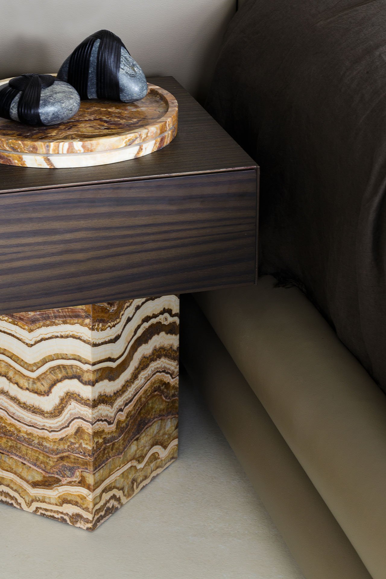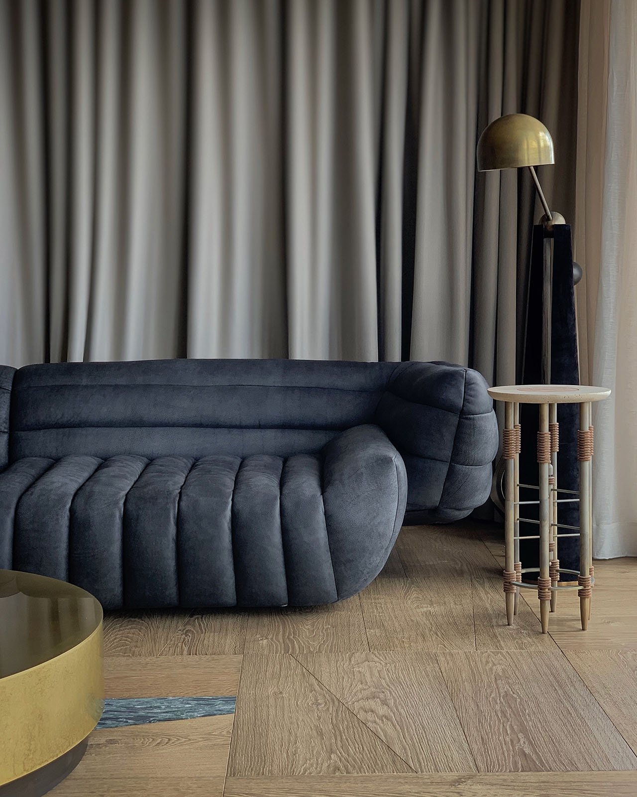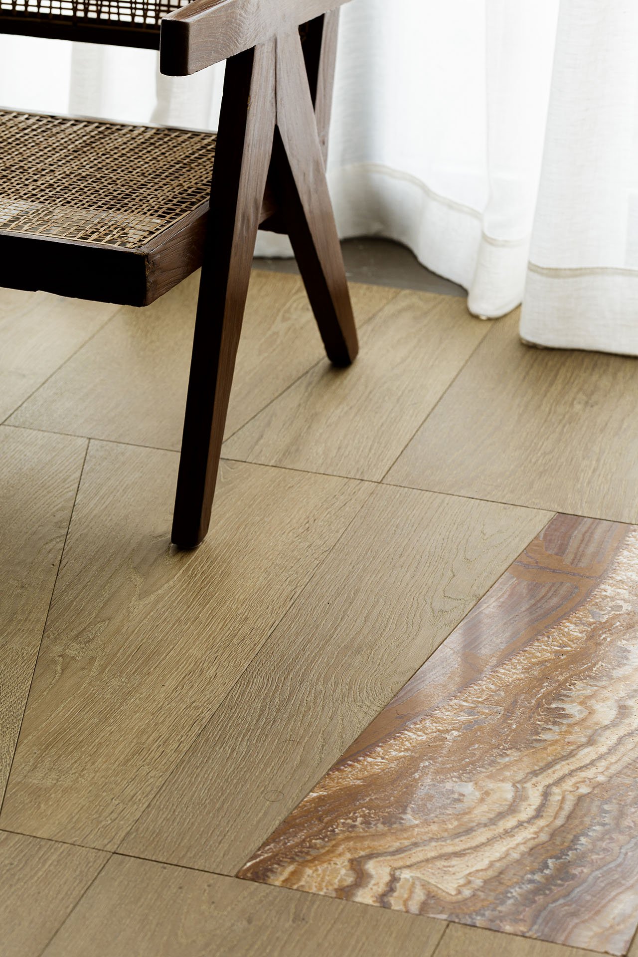 仔细观察客厅的地板不单单是木地板还镶有大理石碎片和氧化金属碎片设计感十足,餐厅毗邻客厅电视墙的黑色大理石台阶贯穿了整个空间。