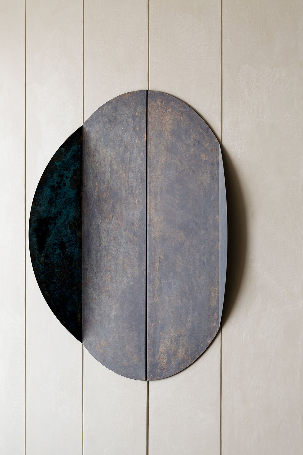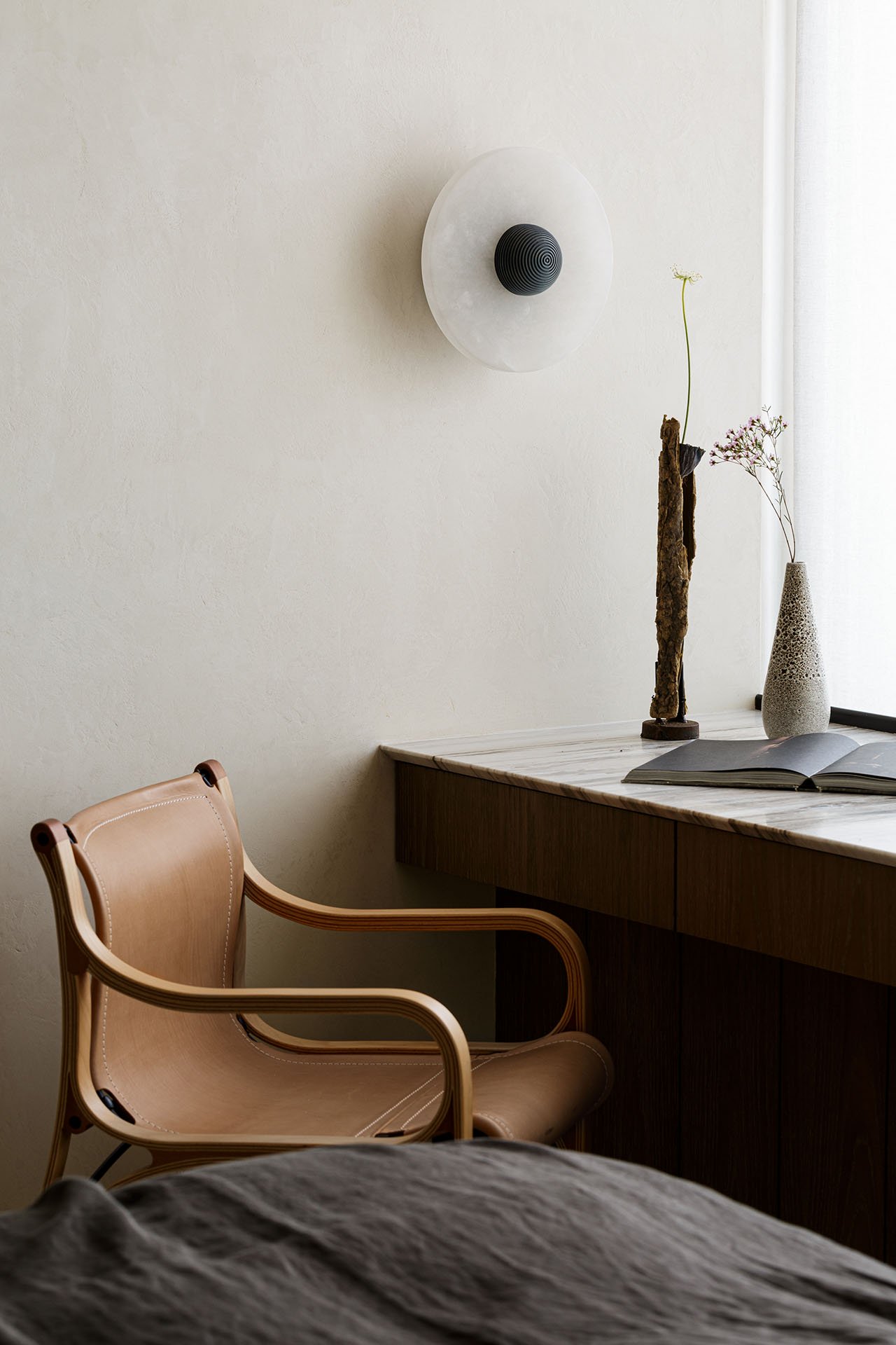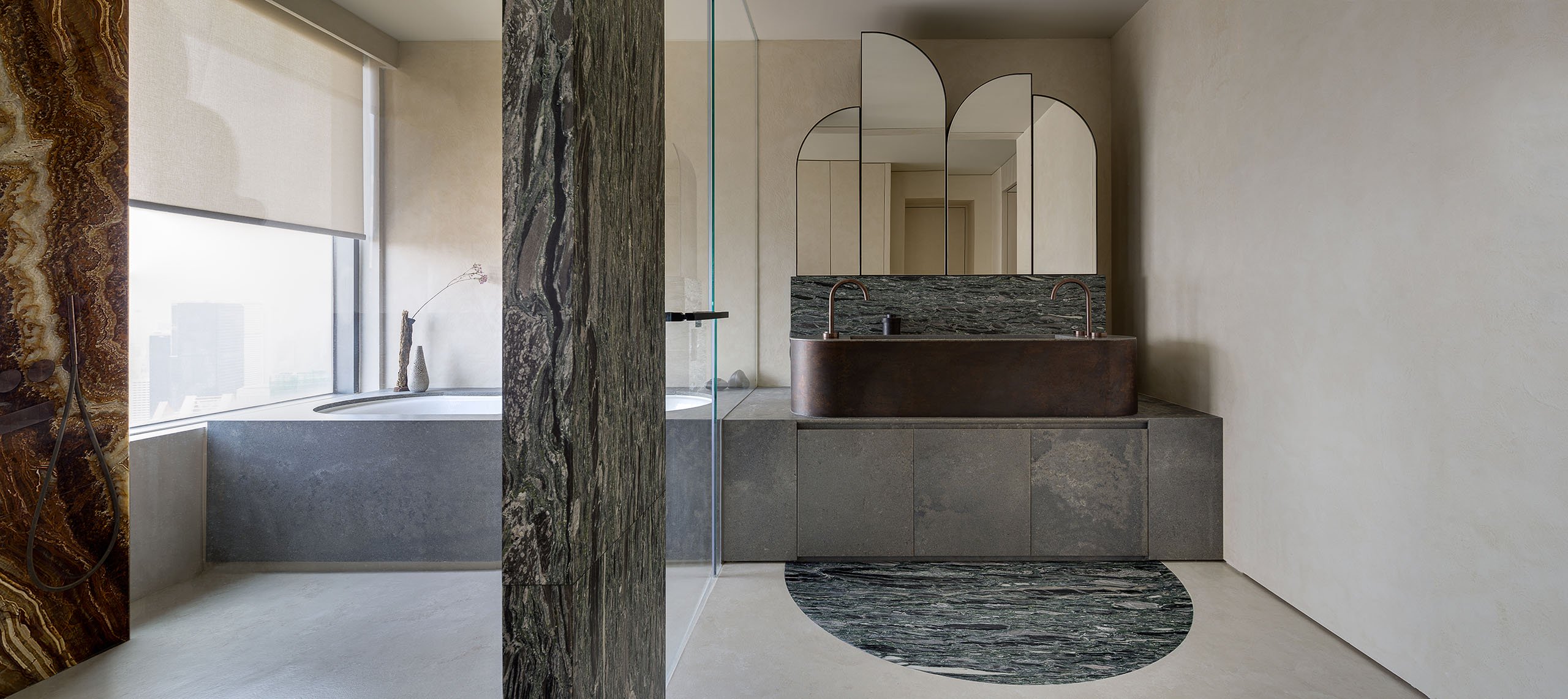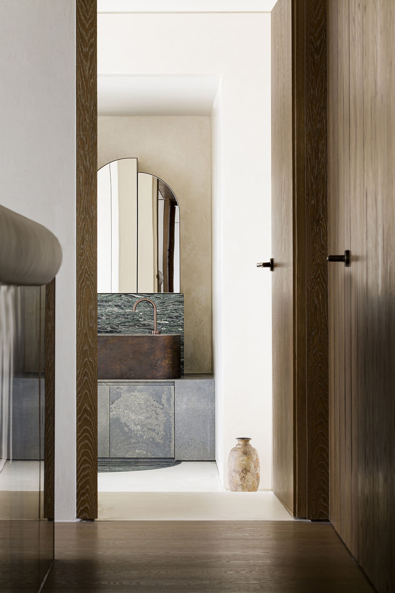过道的尽头是浴室门口放置了一个花瓶作为装饰花瓶的外观充满复古感,浴室的洗手台以大理石和混凝土材质为主,不对称镜子为卧室带来一丝趣味性。
