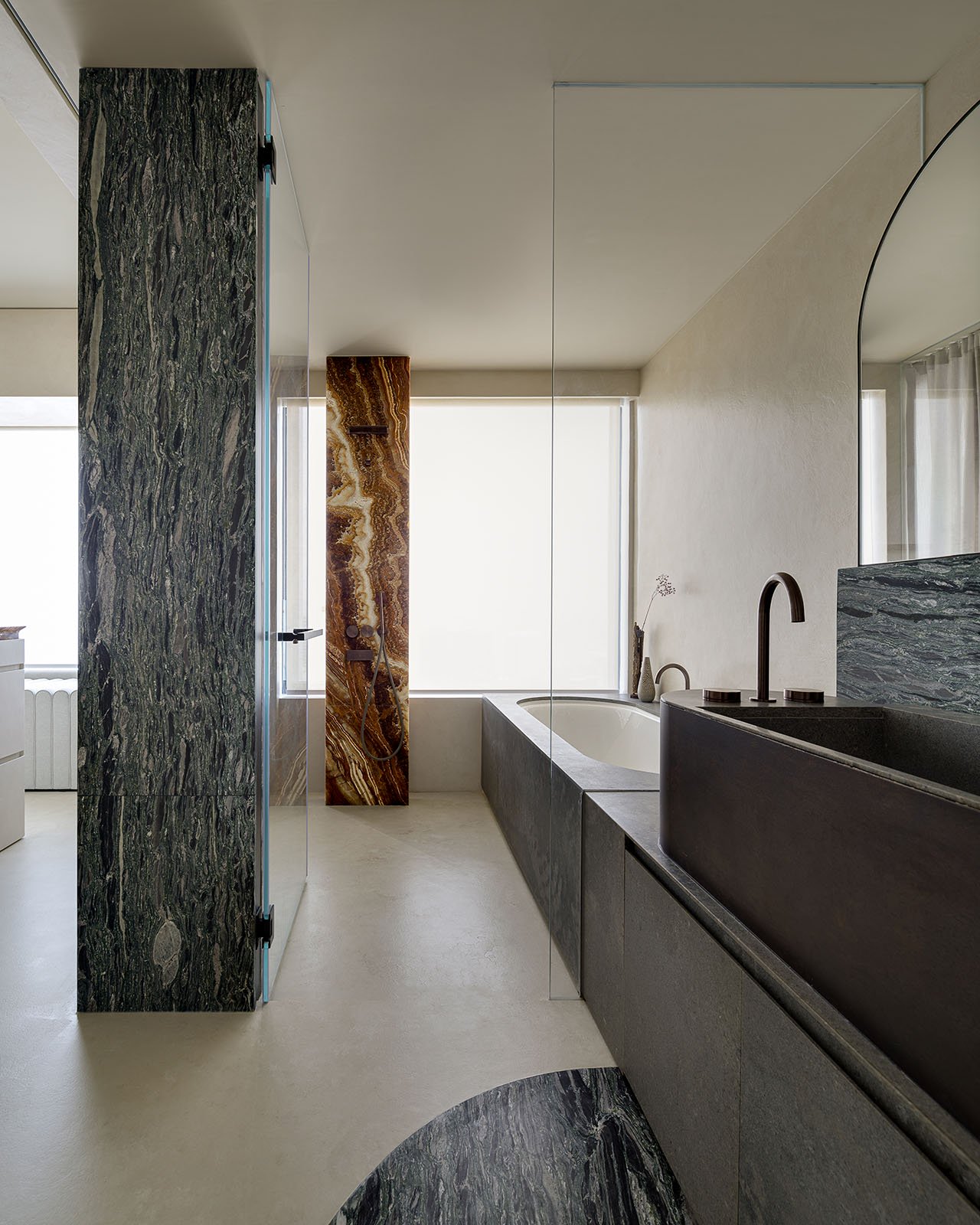 洗手台和淋浴房之间用一扇玻璃门隔开,淋浴器安装在一块暖色调大理石上面既显眼又实用。