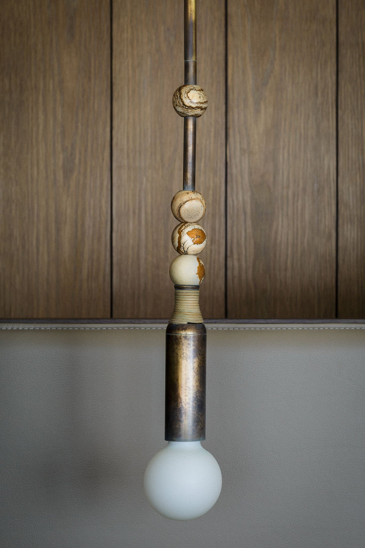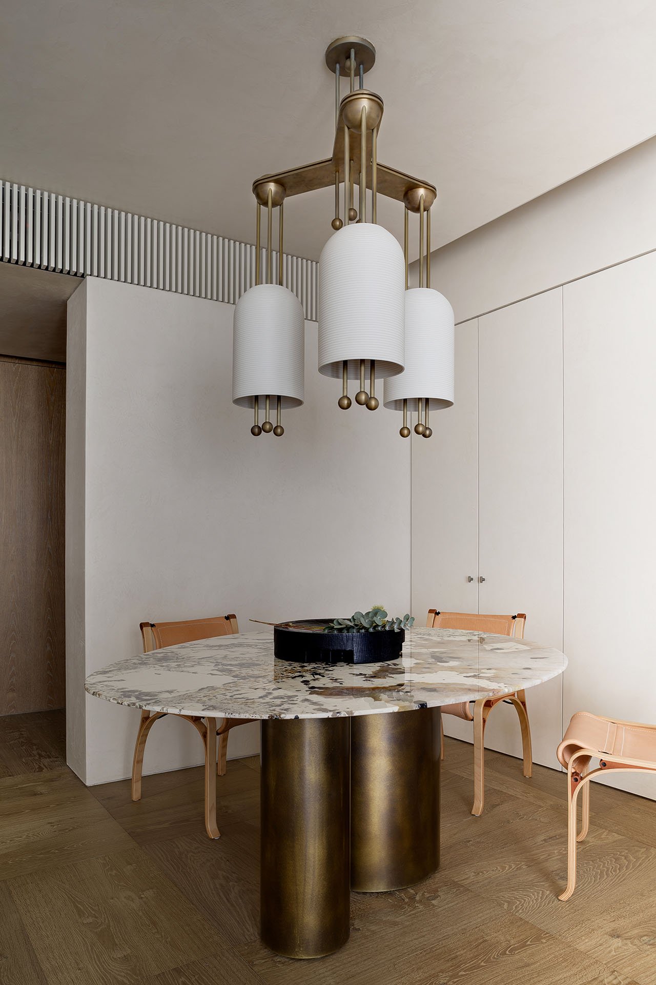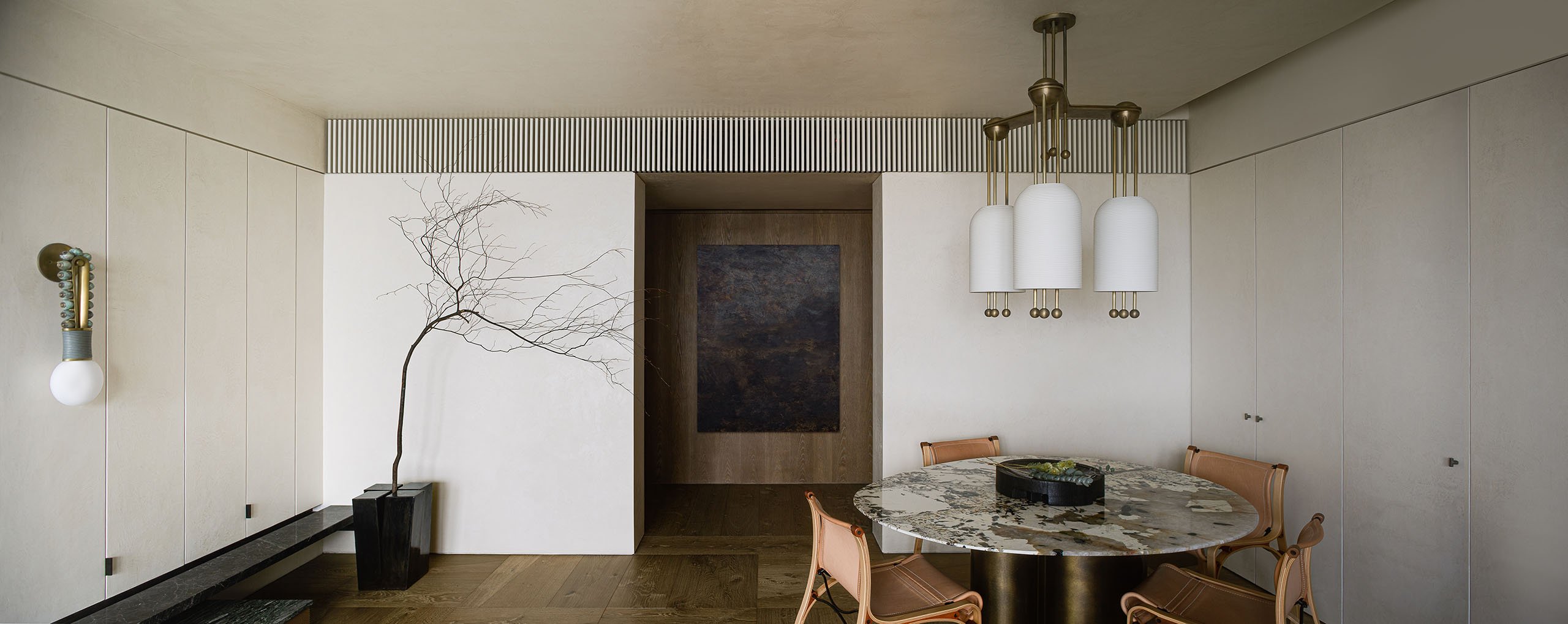 餐桌是由大理石材质与黄铜材质组成的,吊灯则是用白色瓷器和暖色调黄铜制成外观非常奢华。电视墙中间是一扇隐藏式的门是通往卧室的过道,整个过道以木饰面包裹既简约又温馨。
