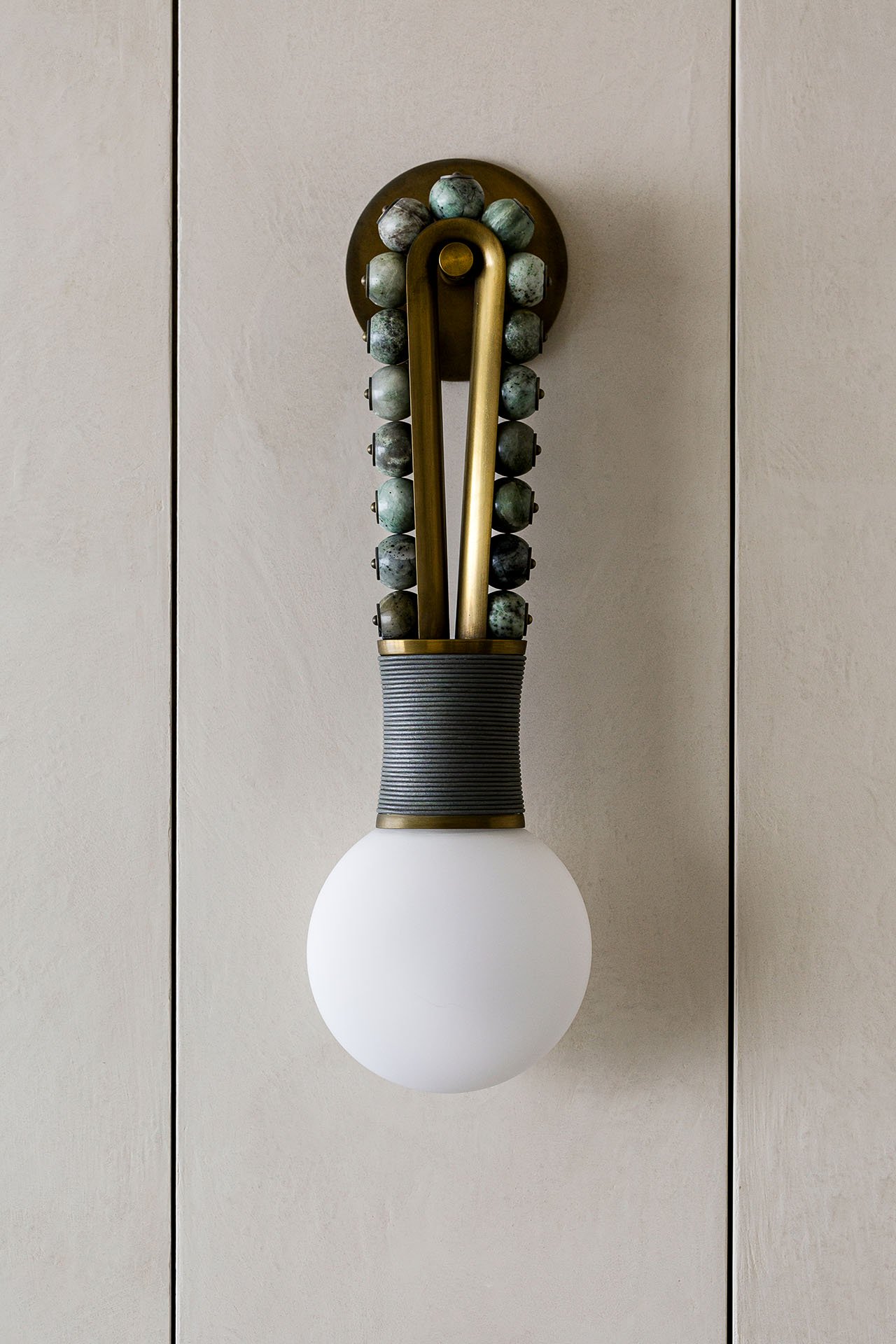门把手选用做旧金属材质把手两边是凸起的方便开关柜门,壁灯也是采用大理石与黄铜材质优雅的外形让电视墙看上去非常简洁。