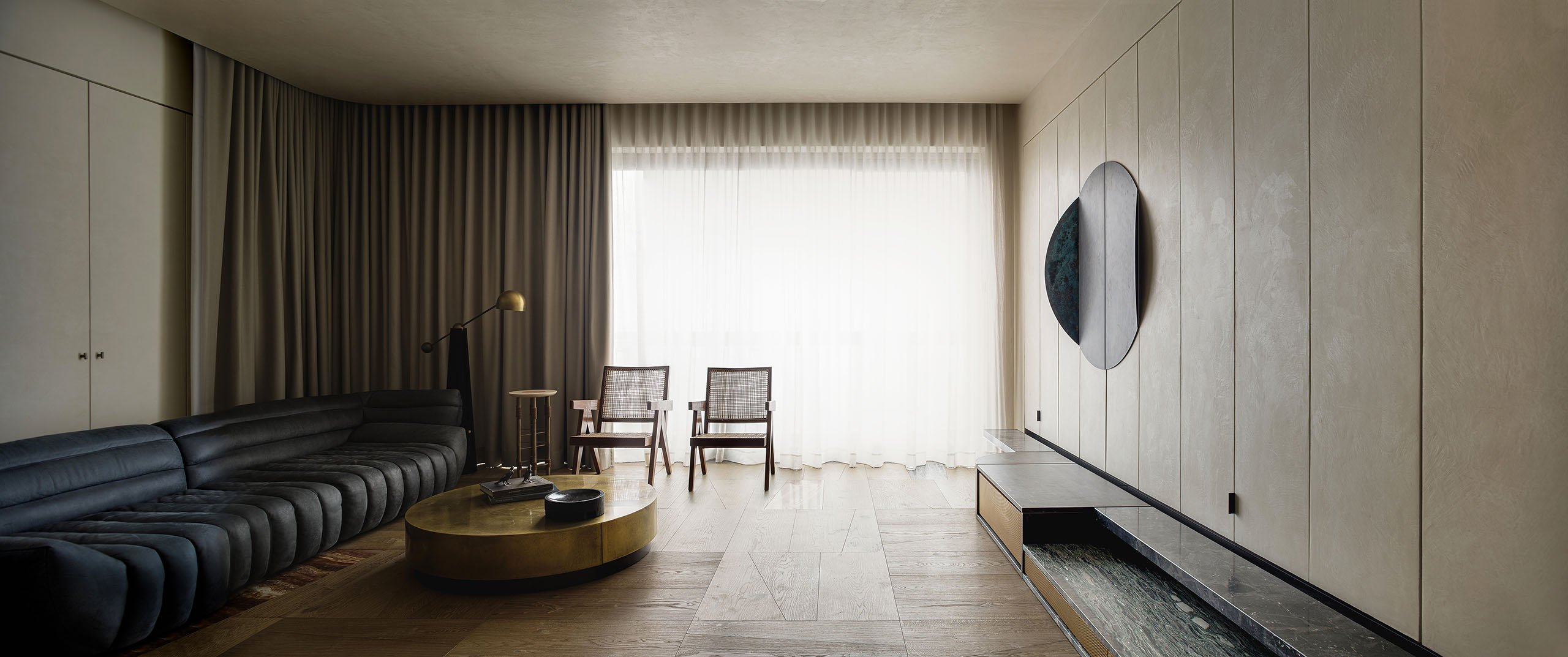 室内以暖色调为主原色木制地板与圆形黄铜茶几虽然颜色相近,但材质上形成明显对比。电视柜是隐藏式的设计,可折叠的柜门是采用白色大理石材质使得电视墙的质感非常好。