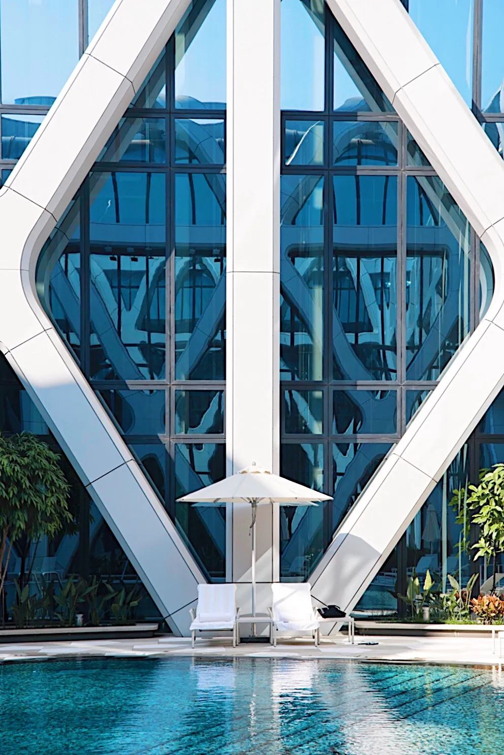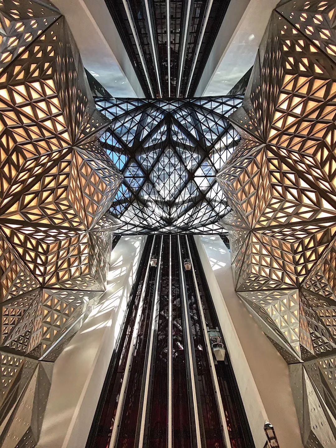 从楼体开始它就没走循规蹈矩的路子,钢筋骨骼完全外包,不规则镂空穿透而过,挥洒着Zaha Hadid工作室一贯的大胆和不羁。进入大堂后的景象更像来到了外星文明,巨大几何晶体一直攀升到半空,外挂式电梯上下飞速穿梭,没见过这么霸道的室内风格!