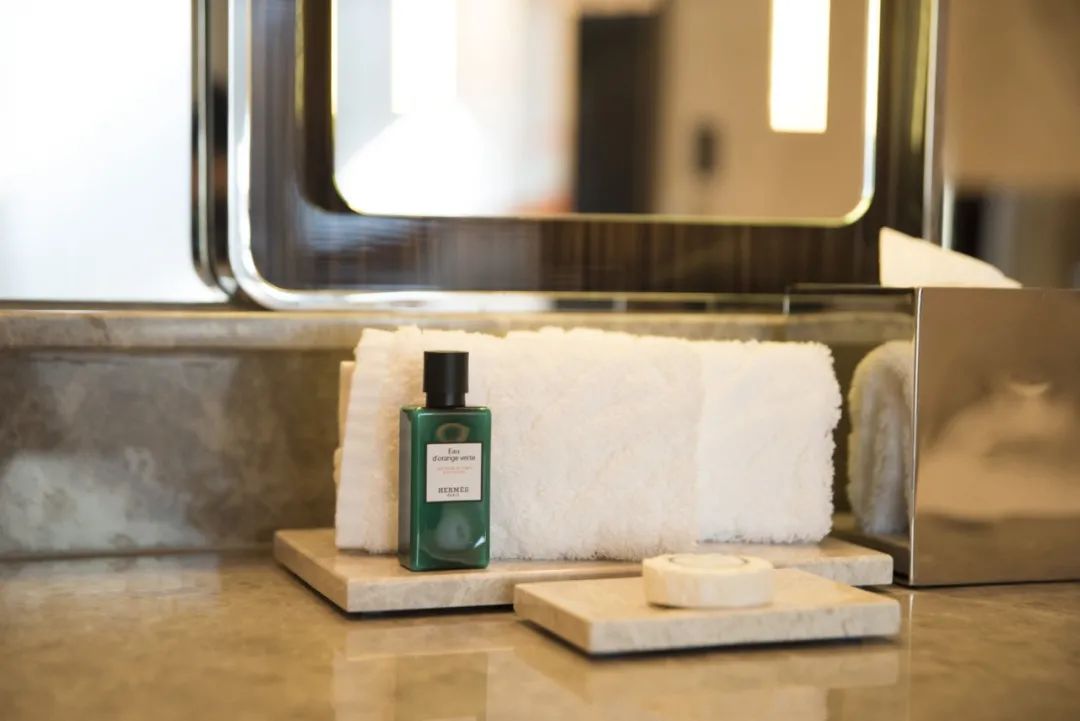 这种智能科技范儿也被用在了视觉干净的卫浴空间,智能座便器选的是高阶的Duravit,聪明地给我也留下了好印象,几何晶体线条的元素则还原在浴缸的造型上,将公共空间的整体风格再次串联。爱马仕的洗护和戴森的吹风配置让细节也妥妥到位了。