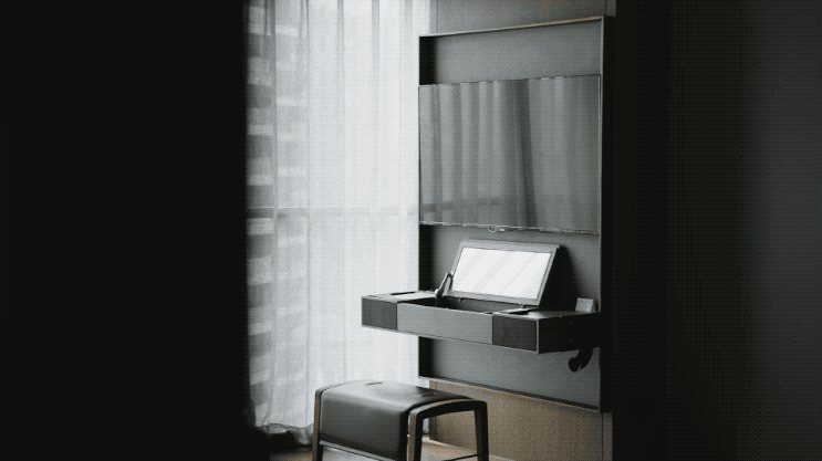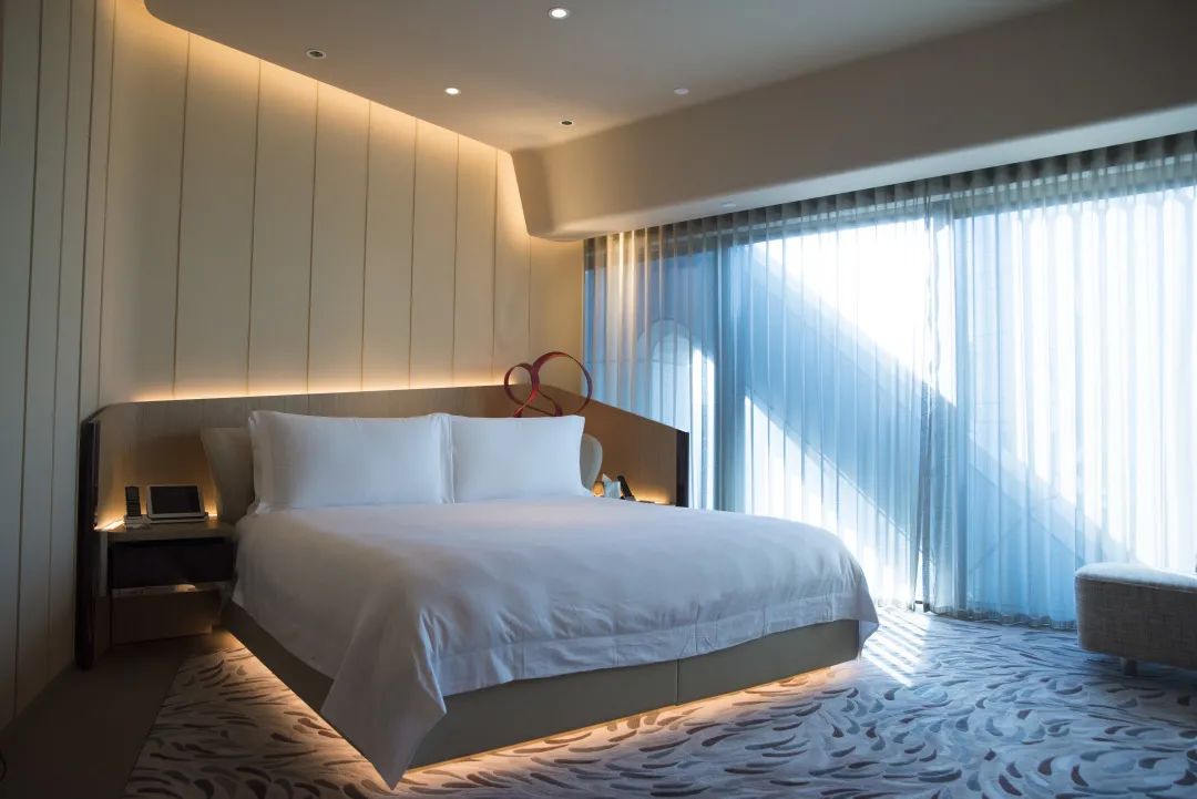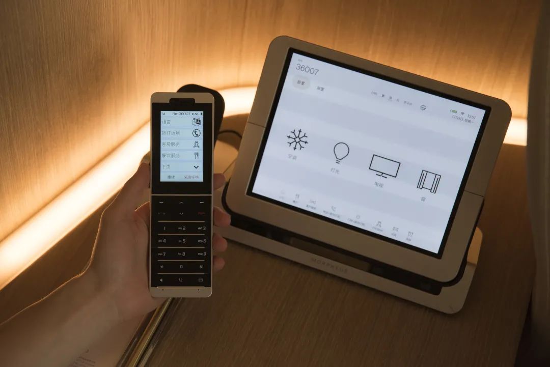 但进入到客房之后,科技的舒适感开始逐渐接管这个阶段的访客体验。线条开始变得柔和,灯光也都用暗藏的方式不露锋芒。房间的所有控制权都集中在了一个pad上面,从窗帘、电视到照明、空调全部整合,动动手指就能操控。对了还给配了一台小手机,随时call out。