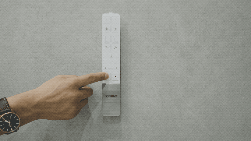 柔润的弧线型设计体现了严谨的德国工艺标准,跟进口的整面岩石纹瓷砖也能刚好呼应。SensoWash闪烁®智能座便器的质感极简风甚至省去了冲水面板,一个小巧的金属拉丝质感遥控就搞定了所有功能。