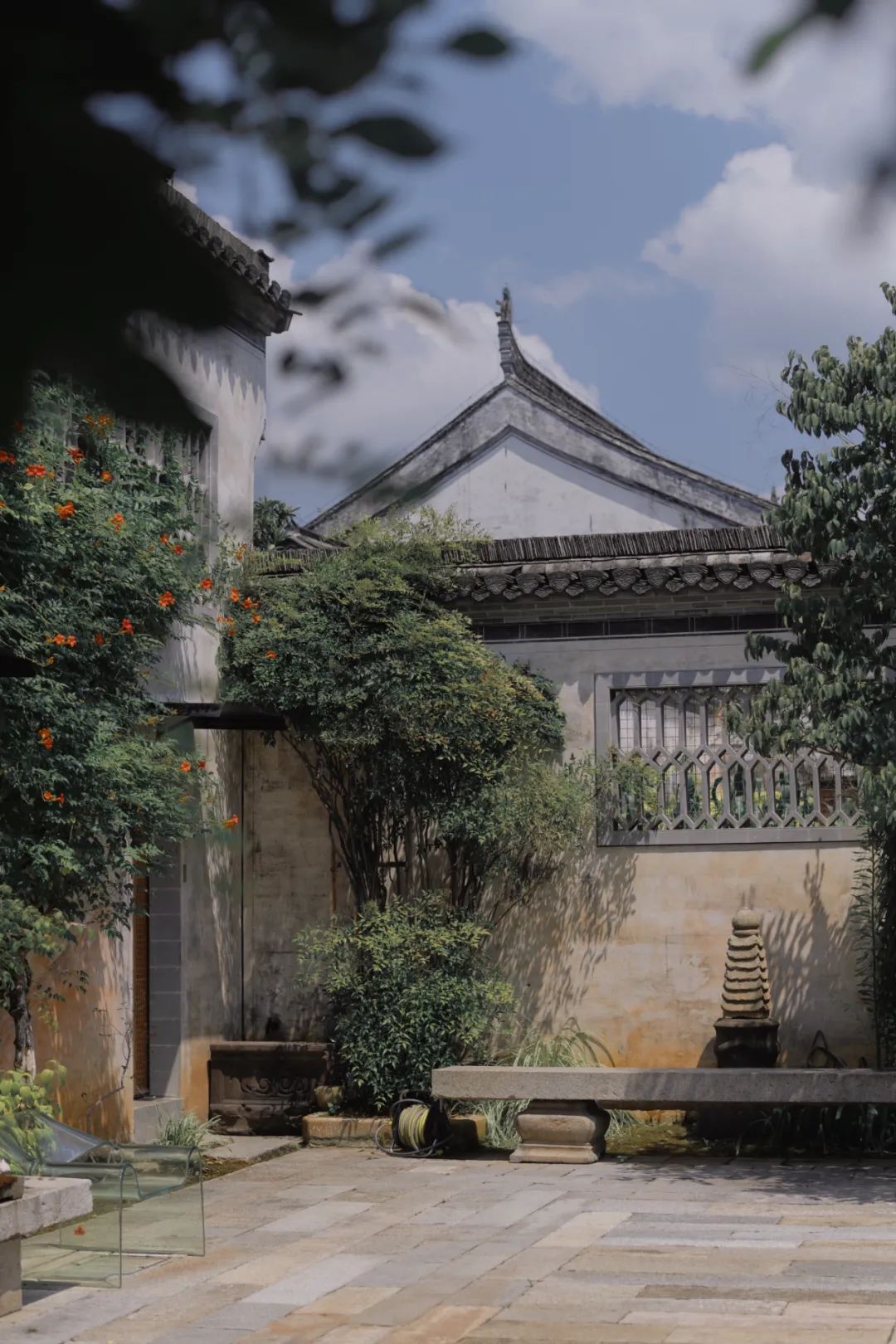 奇松、芭蕉、野生紫藤、老桩红梅、开得正盛的凌霄花……一草一木把中式庭院的雅与趣生动地点缀出来。
