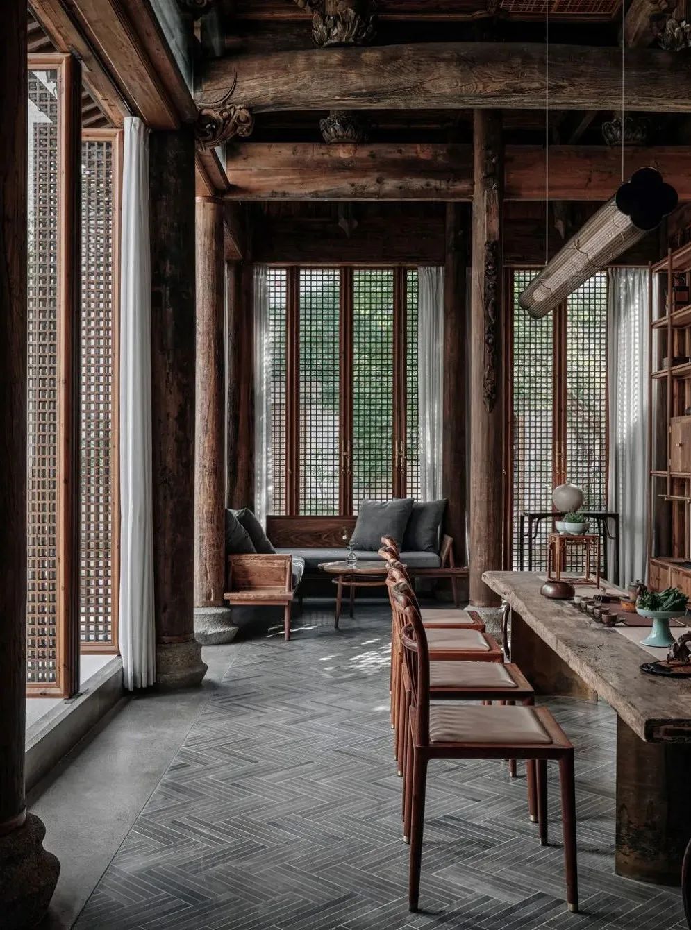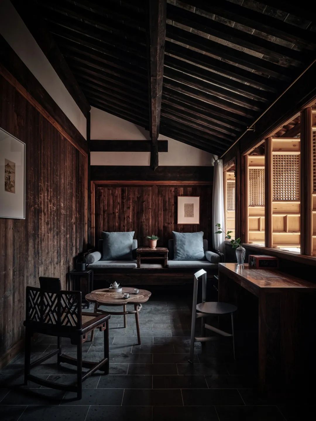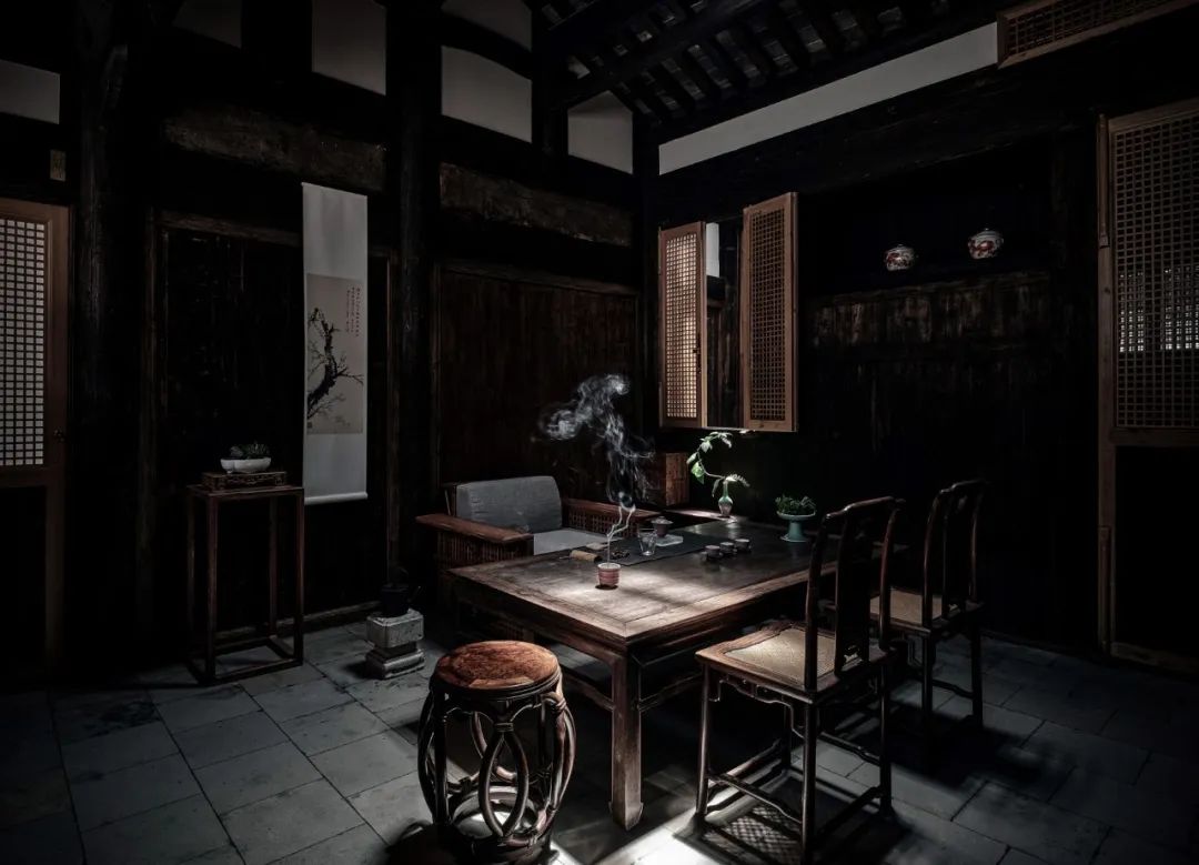 前栋中厅-文郁堂的家具大都是建筑师王灏自己设计,在古旧与现代之间保留着感官上的关联,当新老家具出现在同一空间的时候它们融合得恰到好处。