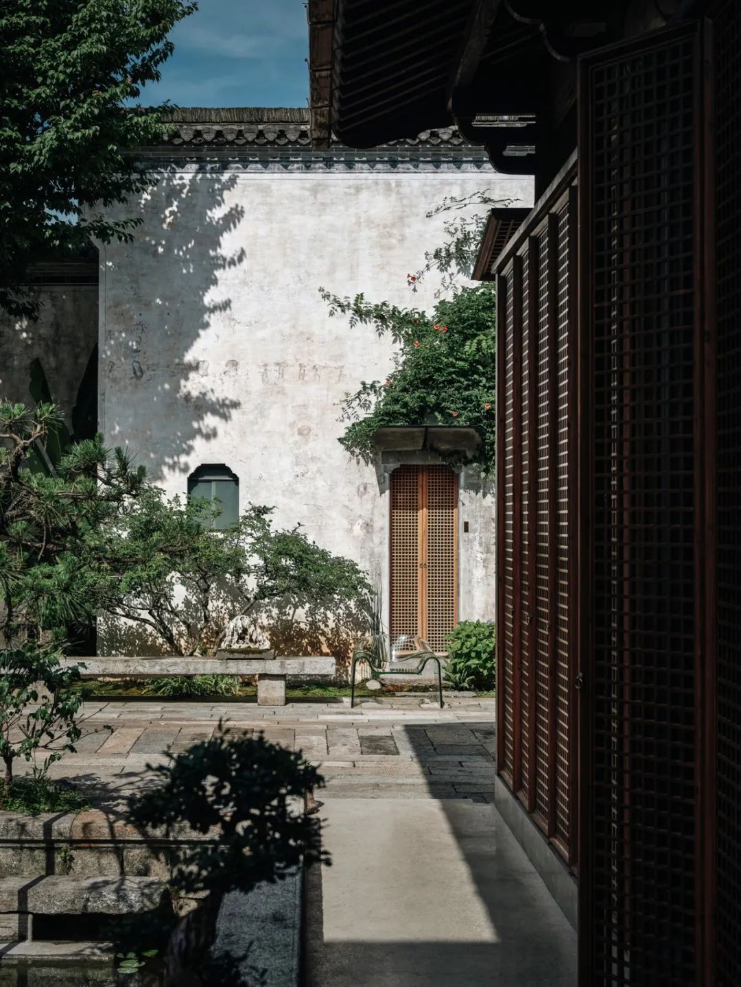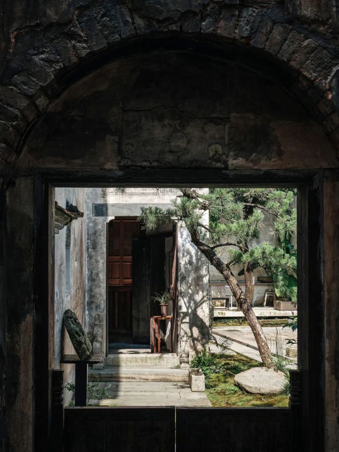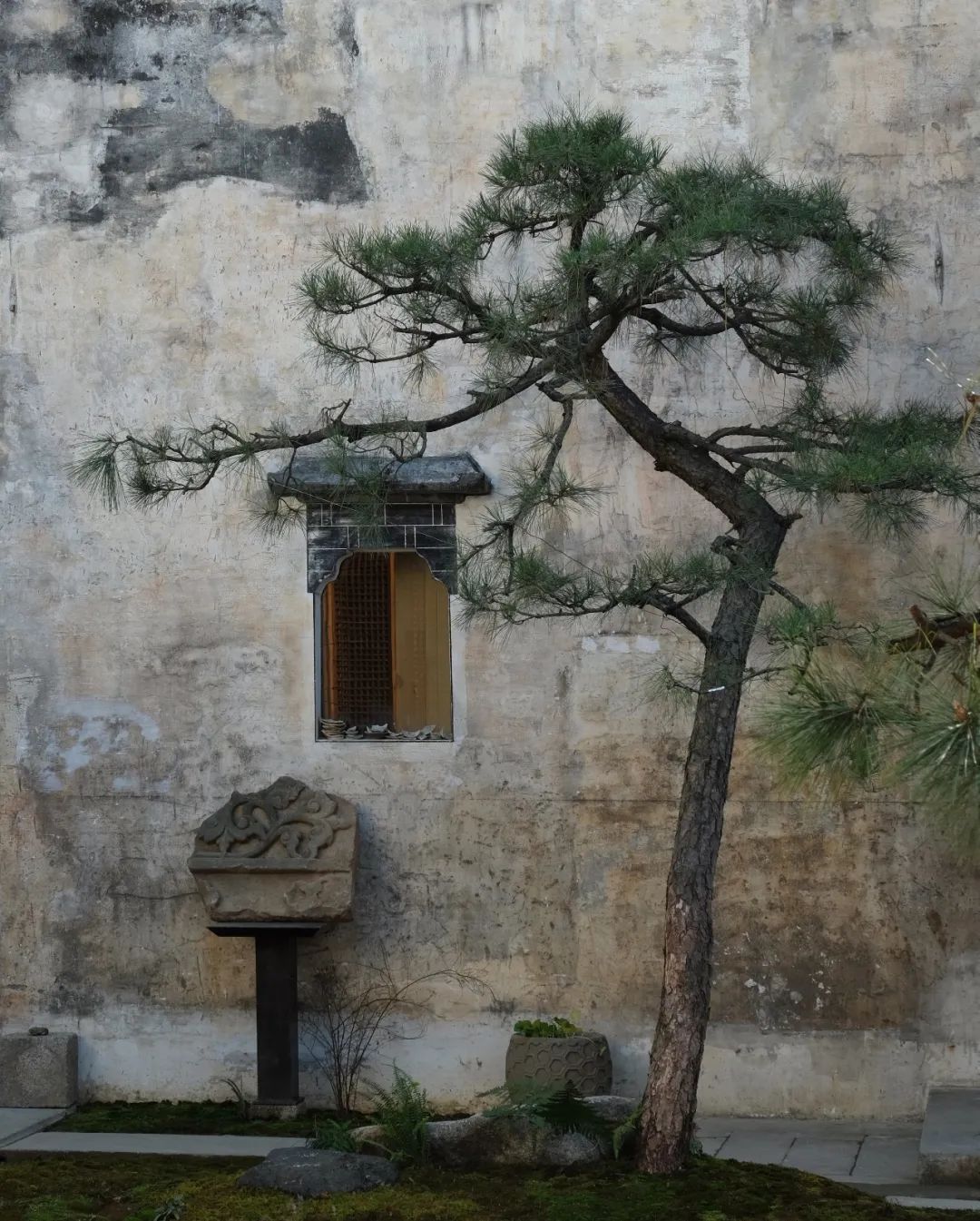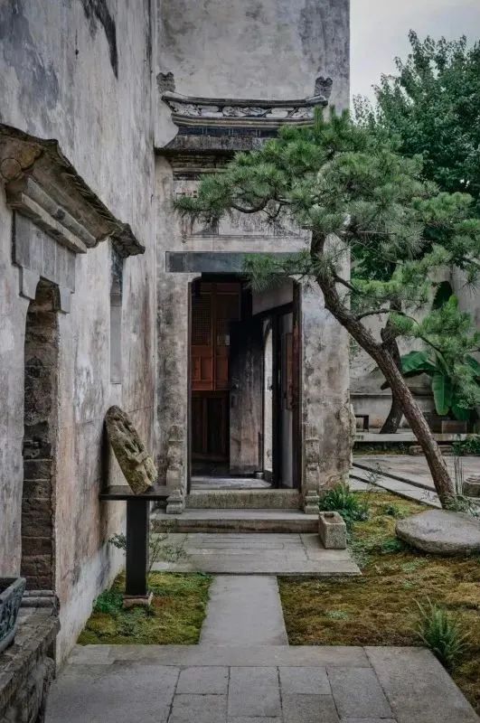 甚至不需出⻔闲逛,收纳一方天地的天井,挂满古字画的中厅,⻔前静立的松与石墩,哪一样不值得细细赏味呢。
